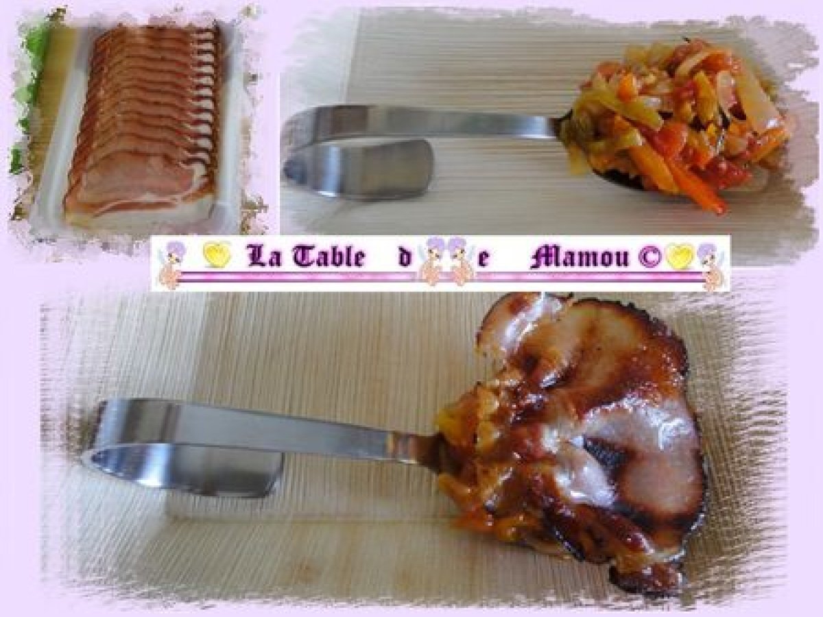 - Remplir la cuillère de piperade, couvrir avec une corolle de lard. Déposer dessus une feuille de basilic.