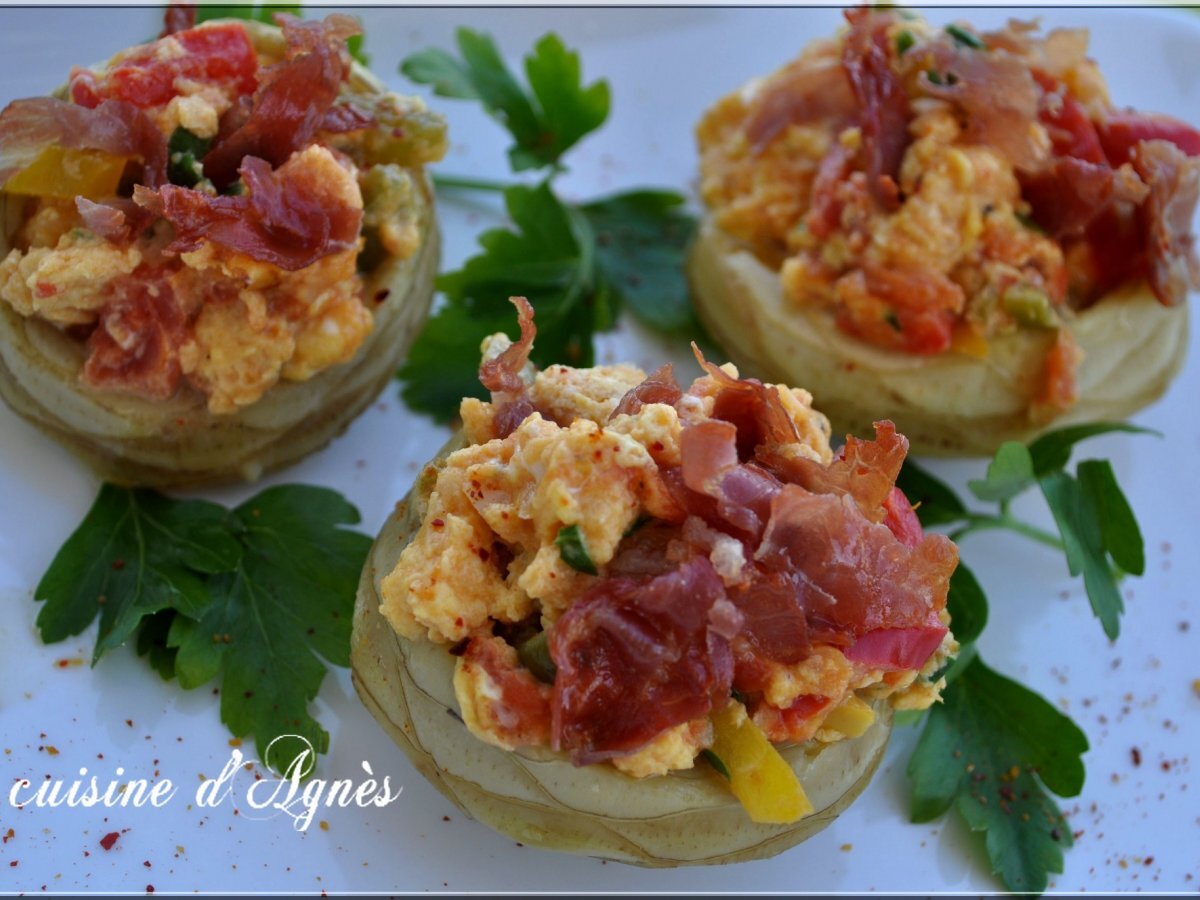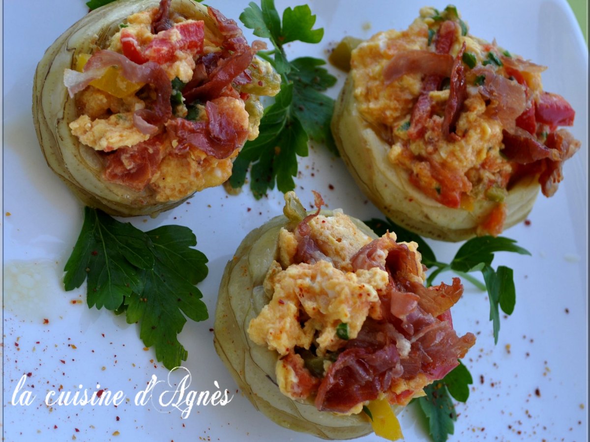 Un entrée colorée aux saveurs du midi avec ces fonds d'artichauts garnis d'une brouillade d'oeufs -piperade