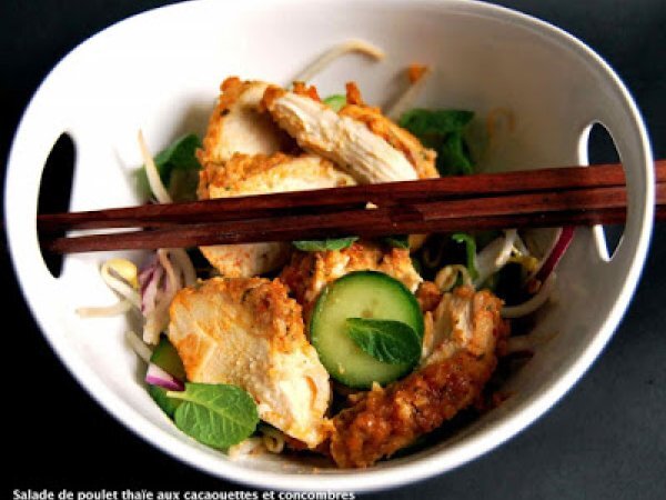 Poulet thai aux cacaouettes, salade de concombres Entréefacile35 min Envoyer cette recette à un ami Imprimer cette page Poser une question à l'auteur Publier votre photo de cette recette Ingrédients 2 2 belles escalopes de poulet fermier ou bio 80 g de cacaouettes grillées et légèrement salées 70 g de pâte de curry rouge 1 cuillère à soupe de Kecap Manis 100 ml de lait de coco de la coriandre fraîche de la menthe fraîche 1 concombre 50 g de germes de soja 1 oignon rouge finement émincé 1 cuillère à café de nuoc mam 1 jus de citron vert 1 cuillère à soupe d'huile d'arachide