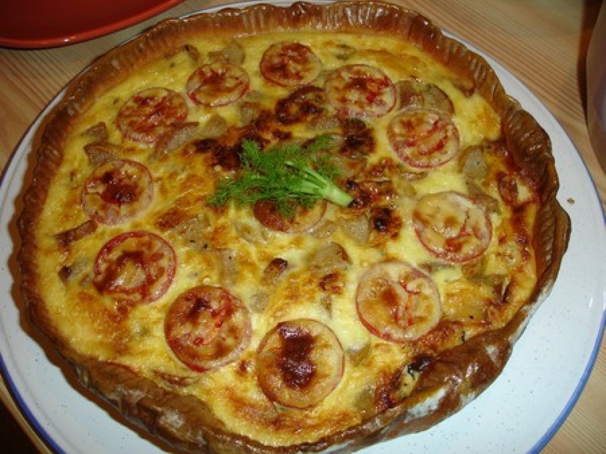 Quiche au bleu d?auvergne, tomates et courgettes, poire.