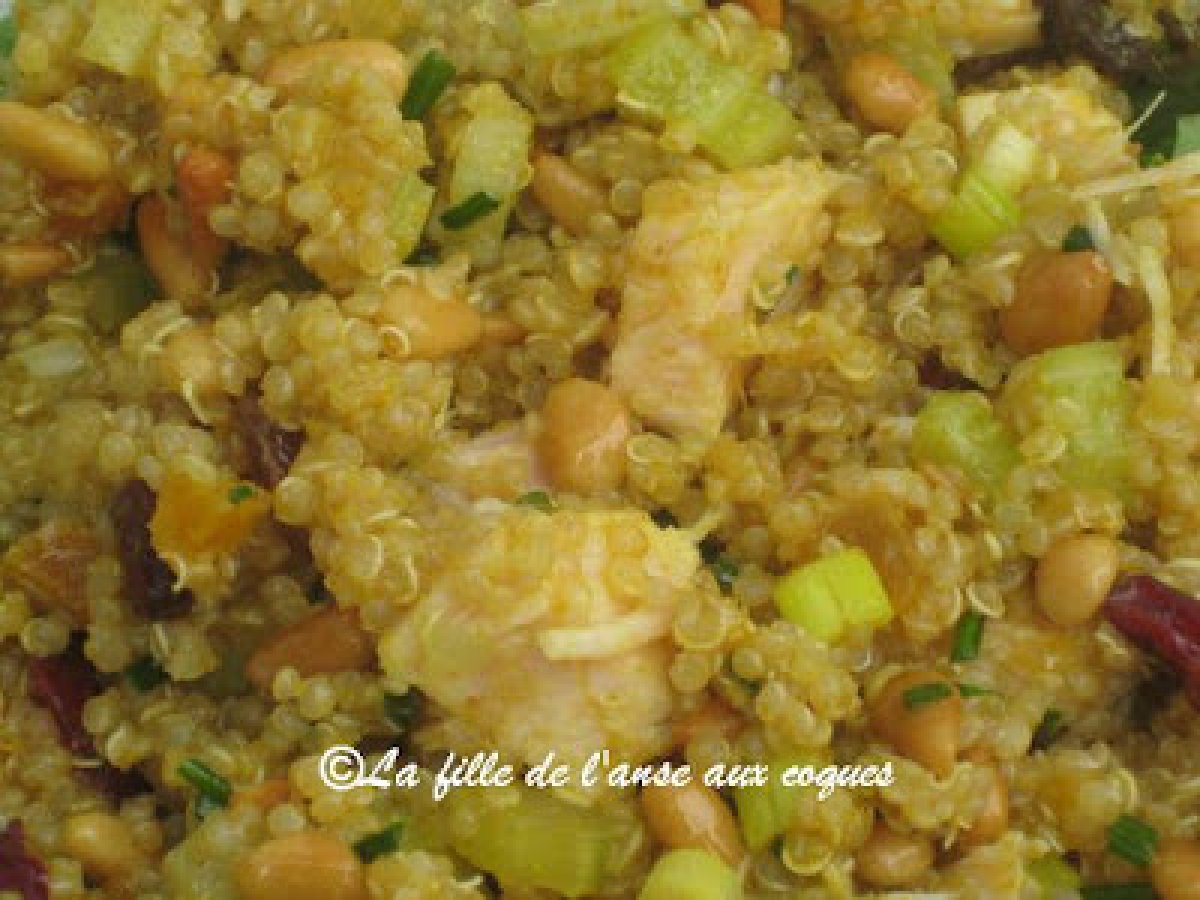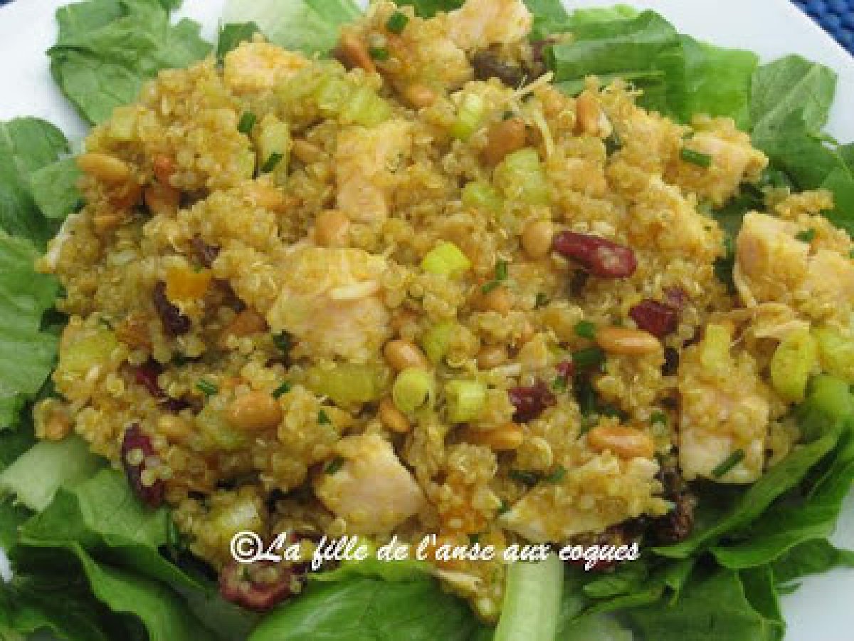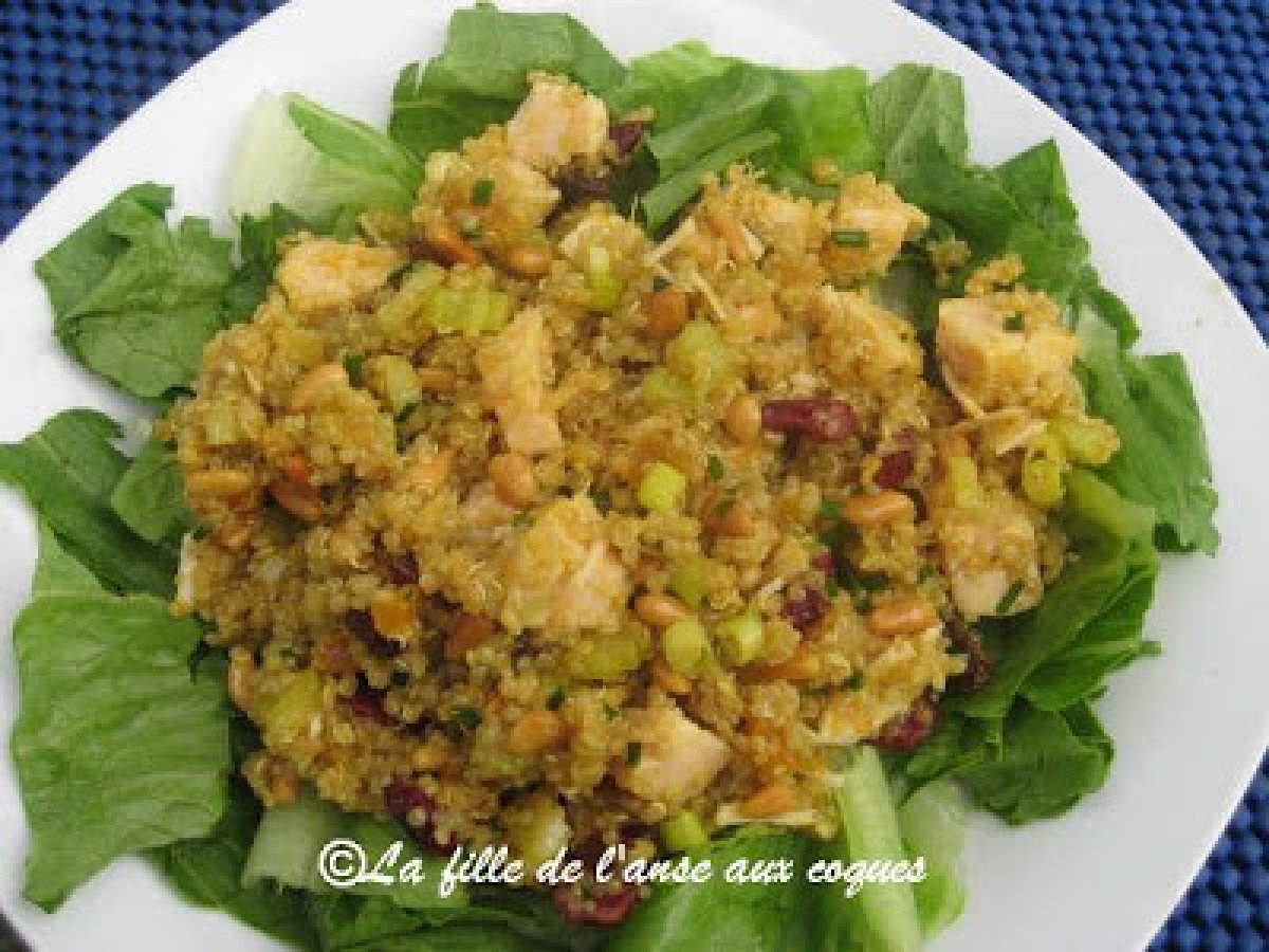 Quinoa au poulet et au cari votez maintenant PrécédentSuivant Entréefacile10 min Envoyer cette recette à un ami Imprimer cette page Poser une question à l'auteur Publier votre photo de cette recette Ingrédients 4 2 cuillères à soupe (30 ml) de cari en poudre ¼ tasse (60 ml) de vinaigre de riz ou de vinaigre de cidre ou de jus de citron 1/3 tasse (80 ml) d'huile d'olive extra vierge 2 cuillères à soupe (30 ml) de gingembre frais haché finement ou râpé finement 3 tasses (750 ml) de quinoa cuit 2 tasses (500 ml) de poulet cuit, coupé en dés 1 branche de céleri coupée en dés ½ tasse (125 ml) de fruits séchés (canneberges, abricots coupés en dés, raisins, etc.) 1 bonne poignée de ciboulette ciselée ou 2 oignons verts émincés finement Roquette et / ou bébés épinards ½ tasse (125 ml) de noix de Grenoble ou de pignons (noix de pin) rôtis Sel et poivre du moulin