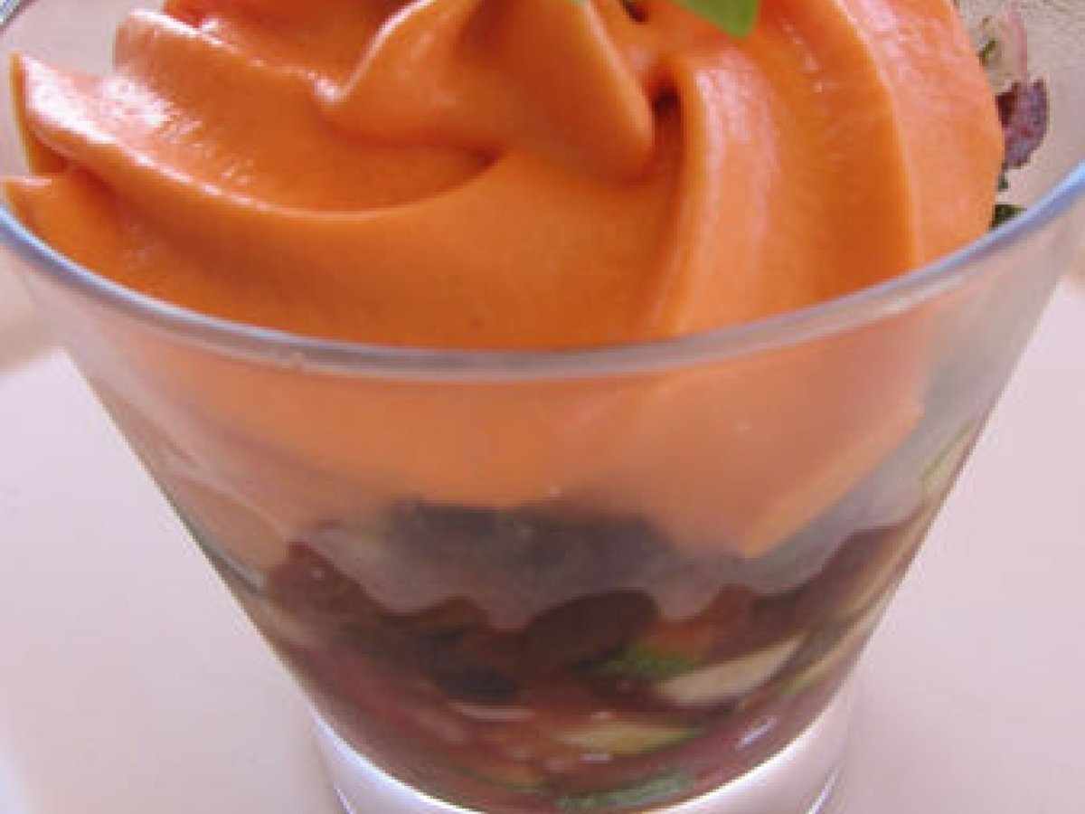 Ajouter les légumes égouttés. Bien mélanger - Répartir les légumes dans de grandes verrines pas trop remplies. Réserver au frais.