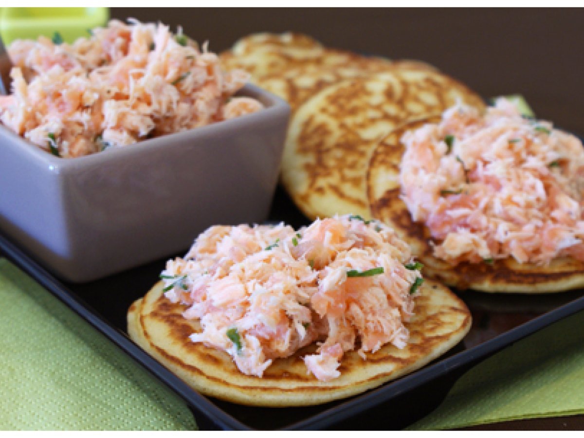 Cette recette propose des rillettes de saumon composées de saumon cuit à la vapeur ou en papillote, mélangé avec du saumon fumé, de la ciboulette, du beurre et du jus de citron vert pour une texture onctueuse. Elles sont accompagnées de blinis moelleux préparés avec une pâte levée à base de farine, œuf, lait et levure, cuits à la poêle. Dégustez ces rillettes aux saveurs fraîches et légèrement acidulées sur des blinis tièdes pour un contraste fondant et parfumé.