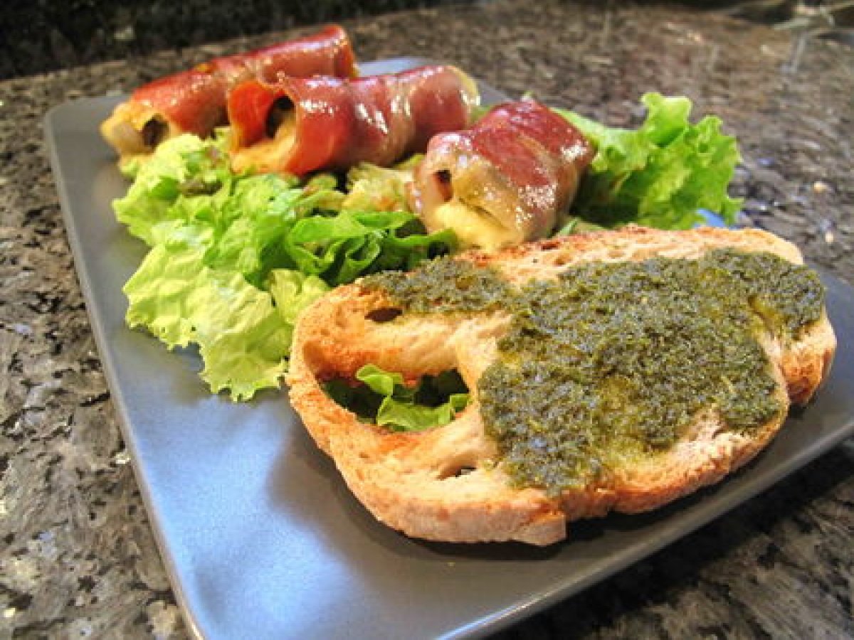 Rouleau aubergine jambon cru pesto et fromage votez maintenant Entréefacile30 min Envoyer cette recette à un ami Imprimer cette page Poser une question à l'auteur Publier votre photo de cette recette Ingrédients 2 1 longue tranche de jambon cru 1 longue tranche d'aubergine de 1 cm d'épaisseur 1 cuillère à café pesto 1 petite tranche d'un bon fromage de chèvre mi sec quelques huile olive Servir avec par personne: 1 tranche de pain de campagne grillée 1 cuillère à café pesto 1 poignée de verdure vinaigrette à base d'huile d'olive et vinaigre balsamique