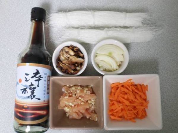 Faites tremper les champignons séchés dans l'eau tiède jusqu'à ils soient ramollis et coupez-les en lamelle finement. Emincez la carotte et l'oignon. Coupez le blanc de poulet en lamelles, faites marinez avec la bière et la purée d'ail environ 10 minutes.