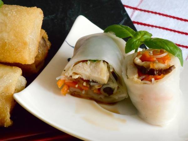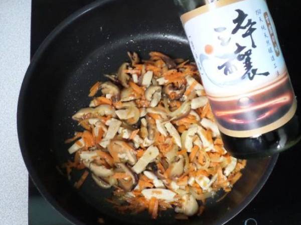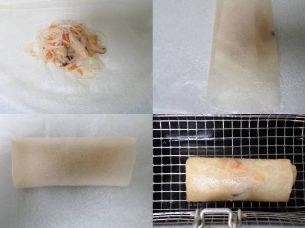Faites chauffer dans une poêle avec 2 c à s d'huile d'olive à feu doux, faites revenir l'oignon et mélangez la carotte, les champignons et le poulet. Puis incorporez le soja et 3 c à s d'eau. Mélangez le vermicelle cuit.Laissez refroidir avant de rouler.