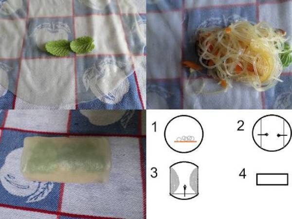 Déposez les feuilles de mentes sur une galette de riz puis incorporez la préparation de l'étape 3 et roulez-la.