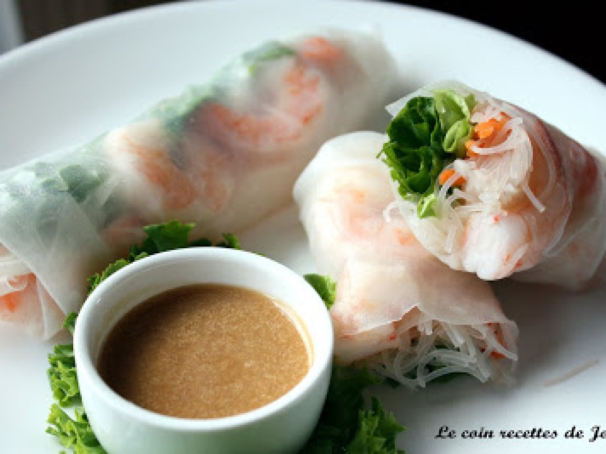 Rouleaux de printemps, sauce à l'arachide Entréemoyen23 min Envoyer cette recette à un ami Imprimer cette page Poser une question à l'auteur Publier votre photo de cette recette Ingrédients 4 30 g vermicelles de riz 2 galettes-feuilles de riz de 15 cm de diamètre des crevettes nordiques 4 feuilles de menthe fraîche 4 fins bâtonnets de carottes 1/4 tasse de laitue, émincée 2 cuillère à soupe de beurre d'arachide 4 cuillère à thé de chacun : vinaigre de riz Irrésistible et eau 1 cuillère à soupe de sauce soya 1 cuillère à thé de chacun : huile de sésame et cassonade 1/2 cuillère à thé de gousse d'ail, finement hachée