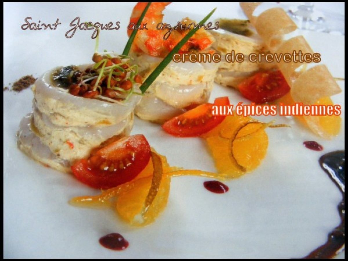 Saint jacques aux agrumes et crème de crevettes aux épices indiennes Entréefacile22 min253 Kcal Envoyer cette recette à un ami Imprimer cette page Poser une question à l'auteur Publier votre photo de cette recette Ingrédients 6 300 g de queues de crevettes 1 grosse pincée de poudre de cumin 1 grosse pincée de poudre de curry 20 cl de crème liquide 400 g de noix de Saint Jacques 1 orange 1 citron Un peu d'huile d'olive Coût estimé: 23.29Euros€ (3.88€/part)