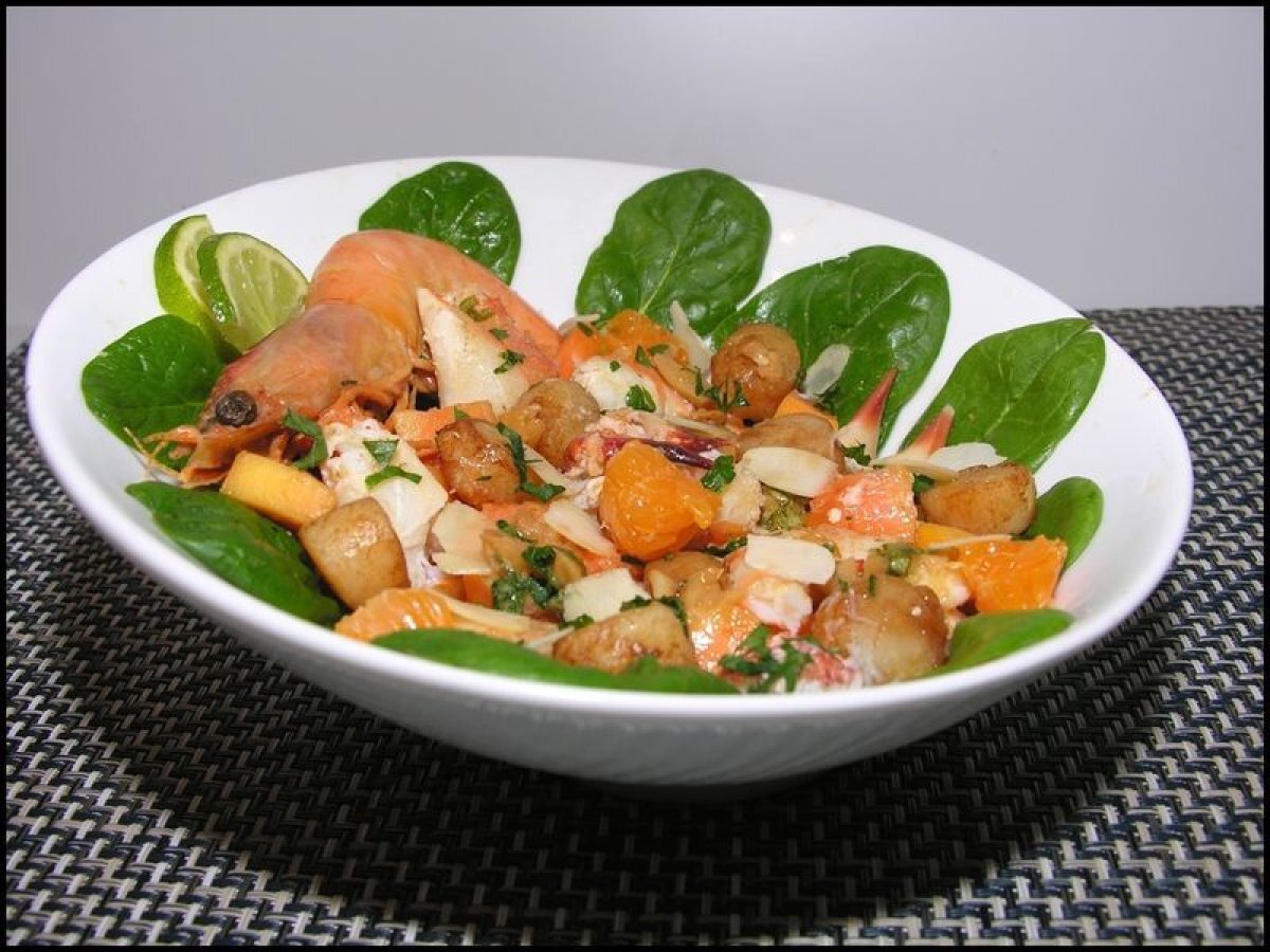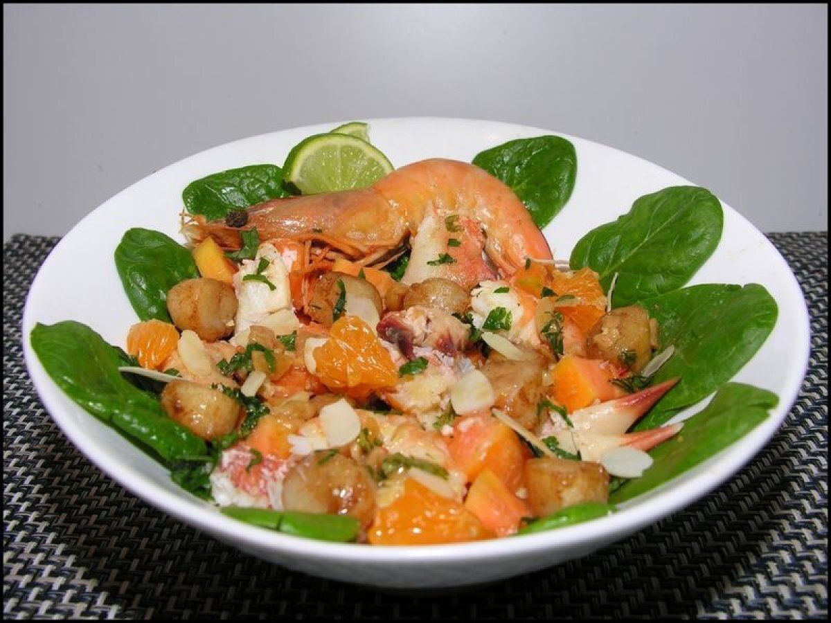 Salade asiatique de pétoncles, crabe et gambas à la papaye et à la clémentine PrécédentSuivant Entréefacile40 min Envoyer cette recette à un ami Imprimer cette page Poser une question à l'auteur Publier votre photo de cette recette Ingrédients 4 400 g de pétoncles surgelés (Picard) 4 pattes de crabes crues fraîches 16 gambas surgelés crus 1 papaye 2 clémentines 1 citron vert coriandre fraîche persil plat quelques amandes effilées Sauce asiatique : 2 cuillères à soupe d'huile de cacahuètes 1 cuillère à café d'huile de sésame 4 cuillères à soupe de jus d'orange pressé 4 cuillères à soupe de vinaigre de framboises 2 cuillères à soupe de jus de citron vert pressé 2 cuillères à soupe de miel liquide 2 cuillères à soupe de sauce soja 2 cuillères à soupe de moutarde quelques cacahuètes non salées écrasées