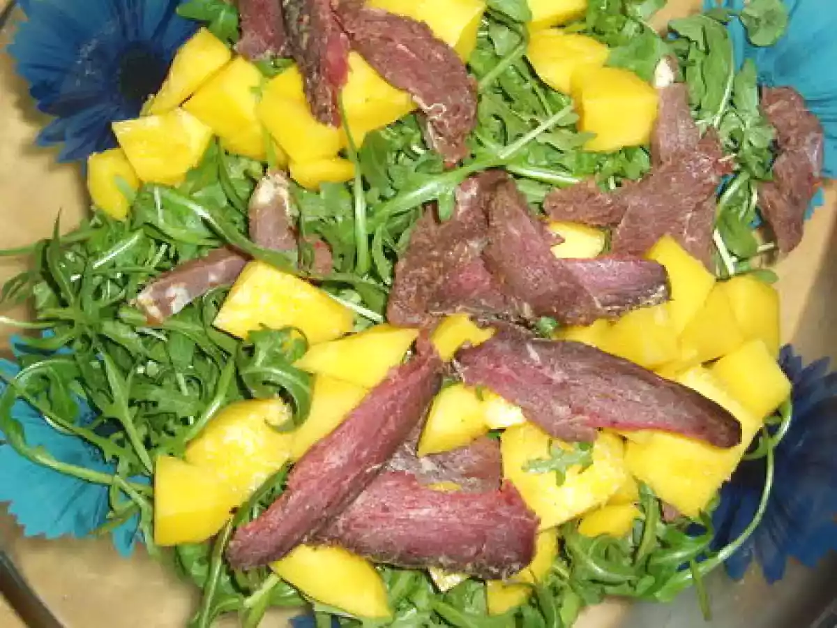 Salade au magret de canard et mangue Entréefacile5 min207 Kcal Envoyer cette recette à un ami Imprimer cette page Poser une question à l'auteur Publier votre photo de cette recette Ingrédients 2 de la roquette du magret de canard séché 1 mangue épluchée et coupée en cubes Coût estimé: 4.6Euros€ (2.3€/part)