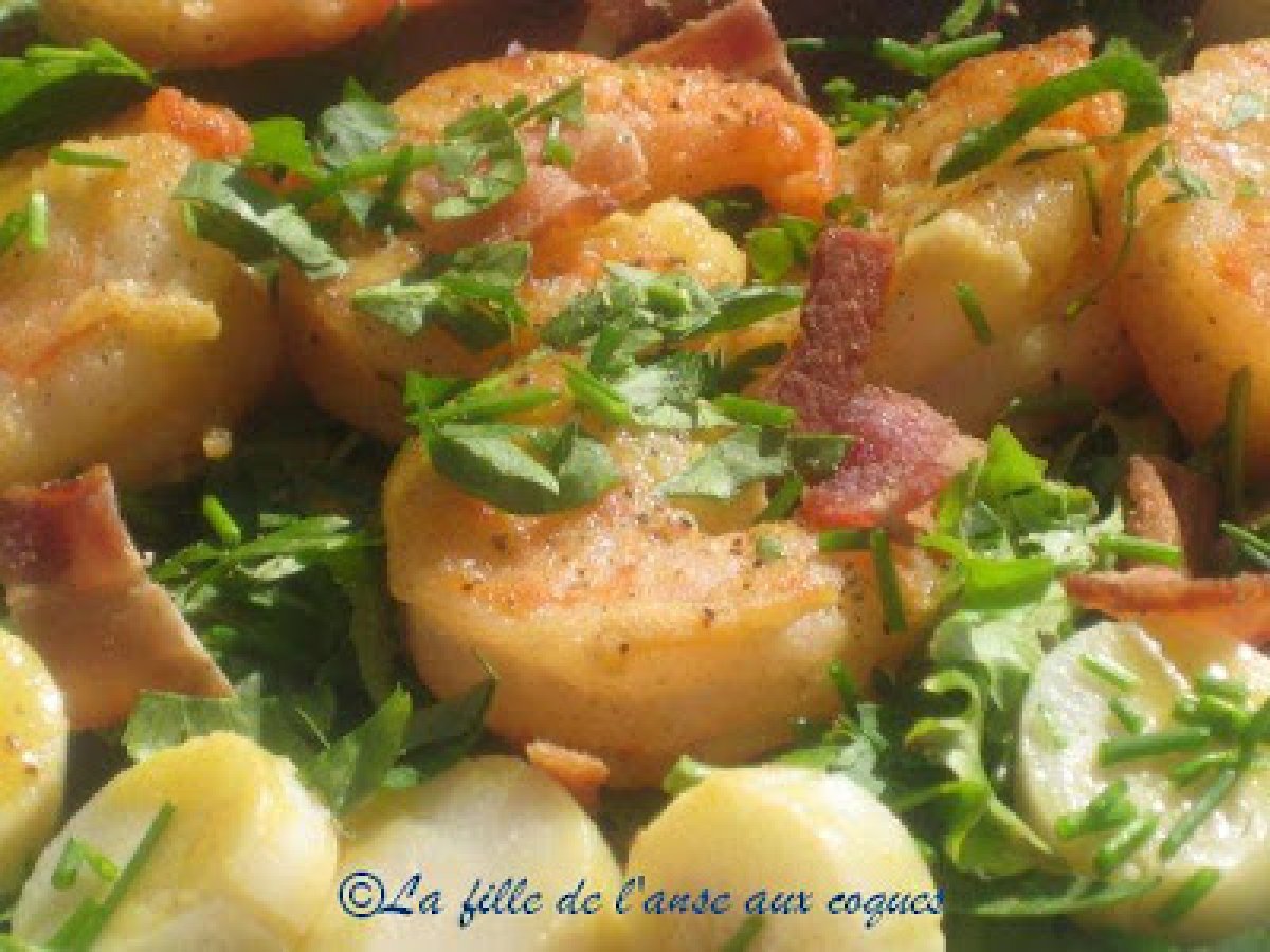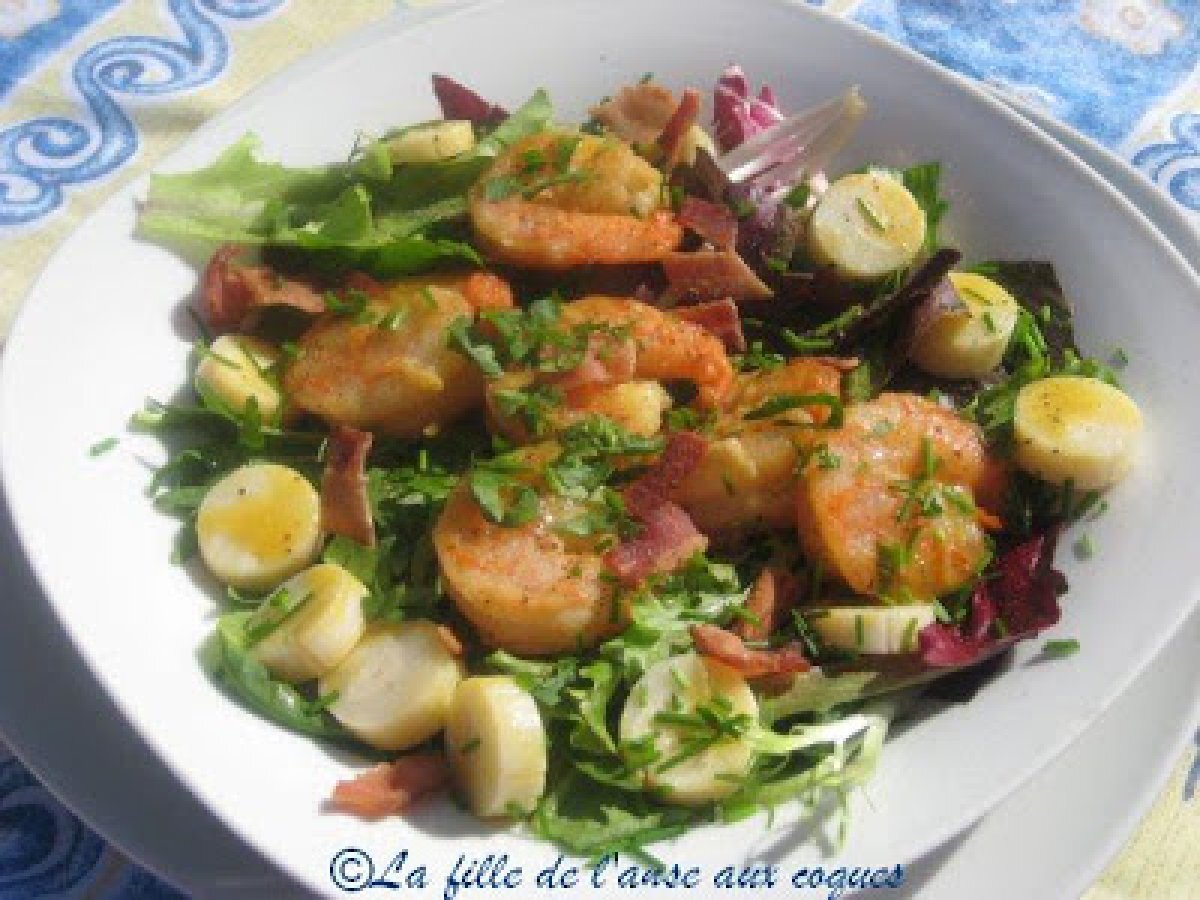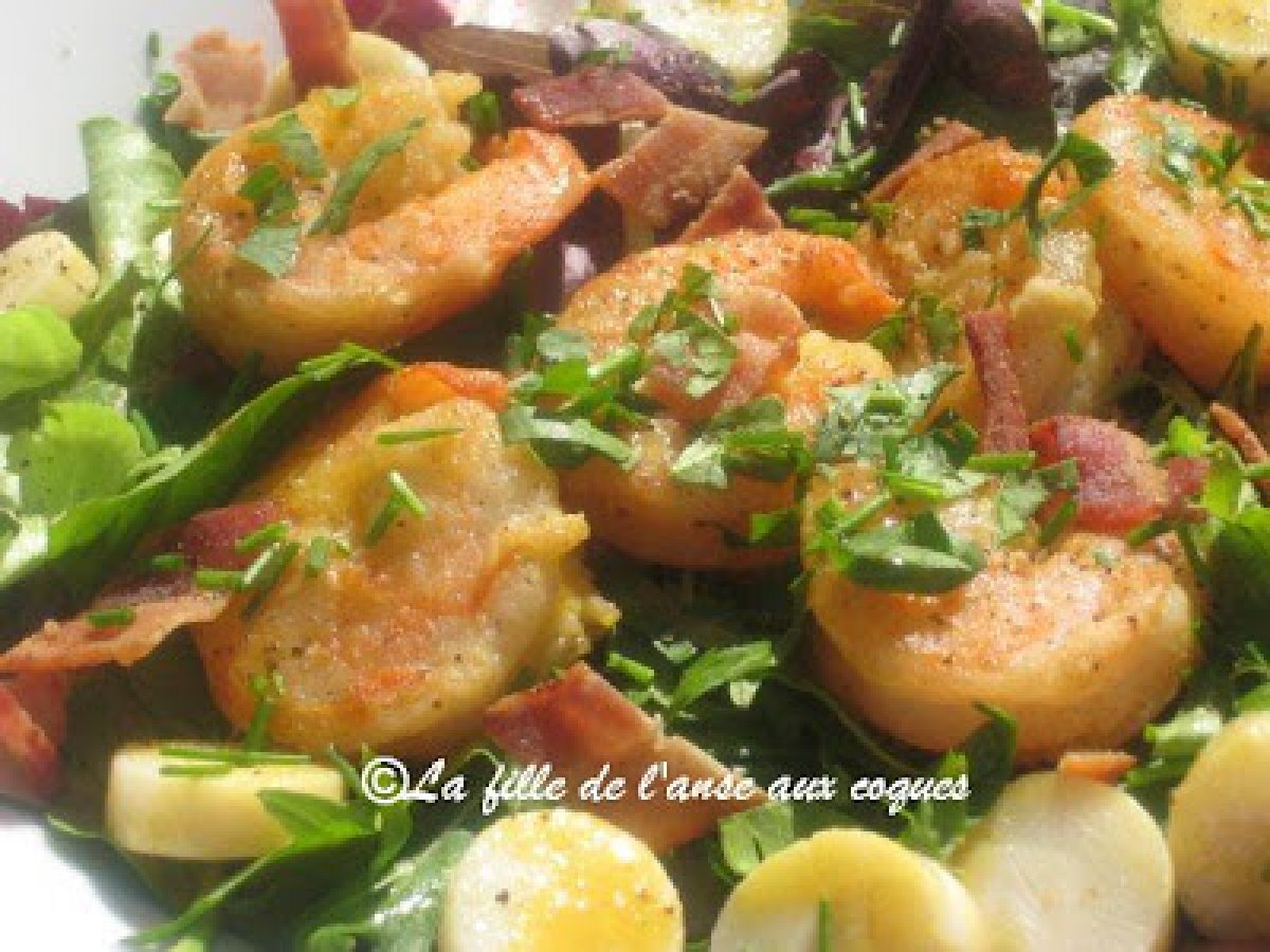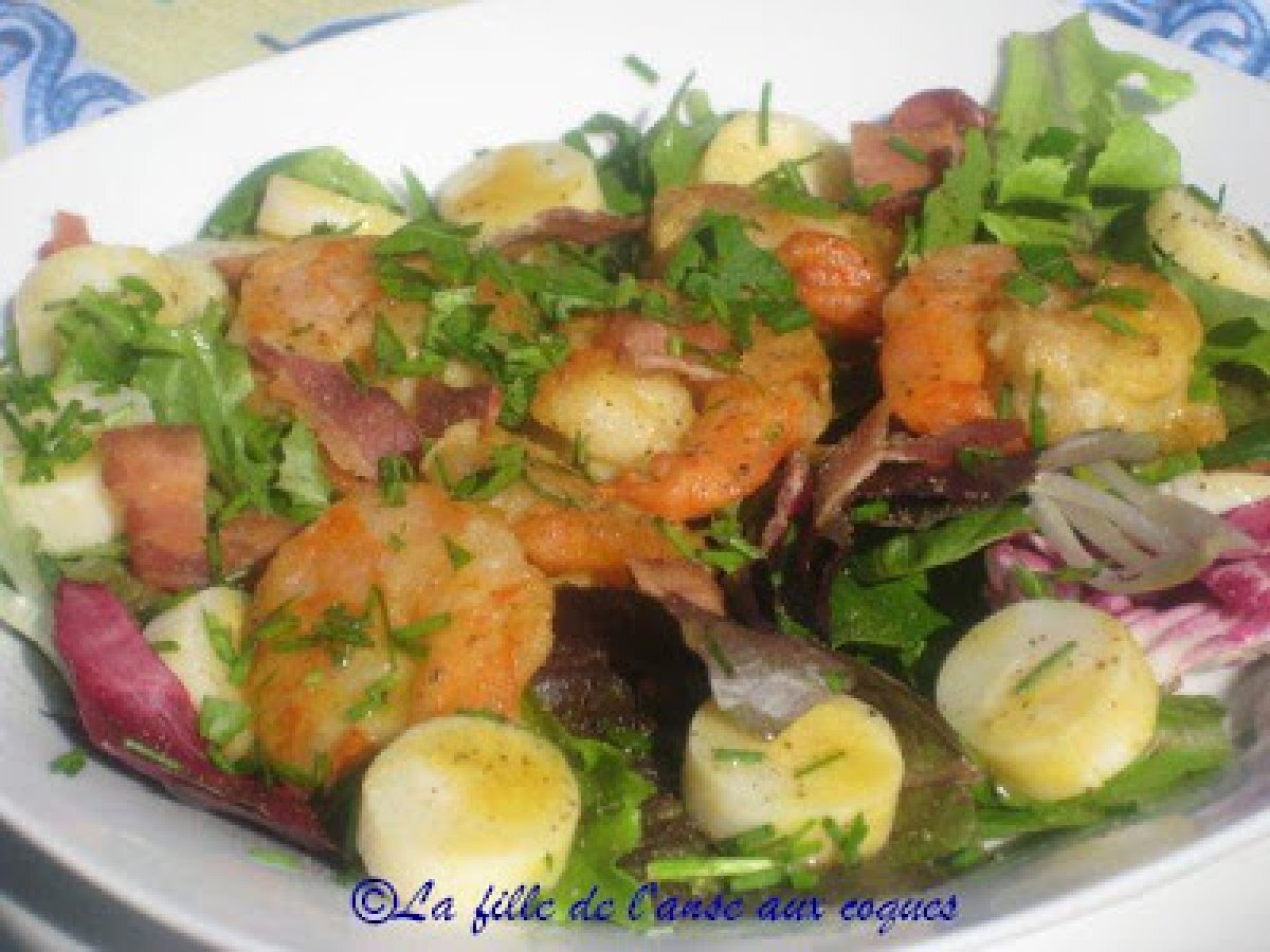 Salade bistro aux crevettes et au bacon votez maintenant PrécédentSuivant Entréefacile30 min Envoyer cette recette à un ami Imprimer cette page Poser une question à l'auteur Publier votre photo de cette recette Ingrédients 6 1 paquet de 142 g de mesclun ou mélange printanier de laitues 454 g de grosses crevettes non cuites 3 cuillères à soupe de farine tout usage ¼ cuillère à thé d'assaisonnement à fruits de mer 6 tranches de bacon Ajout de 1 boîte de coeurs de palmier, rincés, égouttés et tranchés en rondelles 1 tasse de croûtons 1 gousse d'ail émincée 2 cuillères à soupe de moutarde préparée au miel 3 cuillères à soupe de vinaigre de vin rouge 1/3 tasse d'huile d'olive Ajout de poivre Ajout de ciboulette et persil plat frais finement hachés en garniture