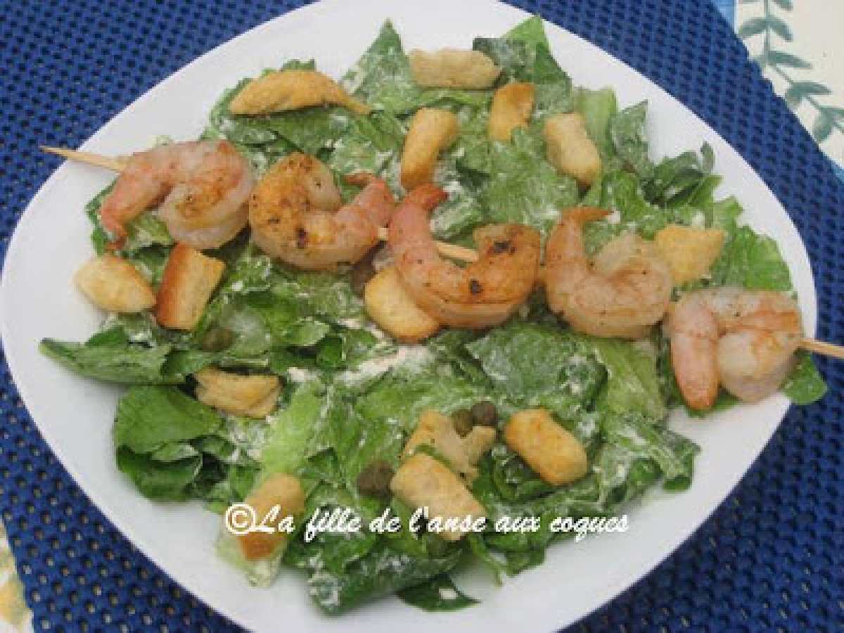 Salade césar aux crevettes grillées votez maintenant Entréefacile25 min Envoyer cette recette à un ami Imprimer cette page Poser une question à l'auteur Publier votre photo de cette recette Ingrédients 4 ¼ tasse (60 ml) mayonnaise ¼ tasse (60 ml) + 3 cuillères table (45 ml) parmesan râpé 1 cuillère table (15 ml) jus de citron 1 cuillère thé (5 ml) moutarde de Dijon 2 filets d'anchois rincés et épongés, hachés finement 3 cuillères table (45 ml) huile d'olive 4 gousses d'ail broyées Sel et poivre au goût 1 ¼ lb (570 g) crevettes fraîches ou surgelées, décongelées, décortiquées et déveinées 1 grosse laitue romaine, déchiquetée 1 tasse (250 ml) de croûtons assaisonnés
