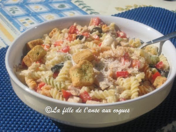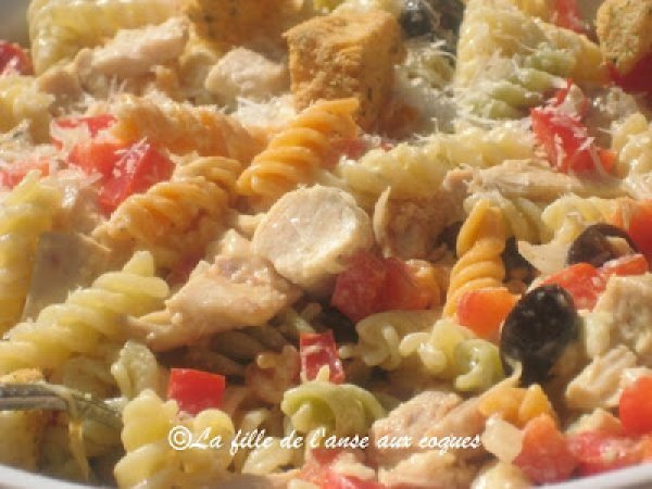 Salade césar de fusili au poulet PrécédentSuivant Entréemoyen30 min Envoyer cette recette à un ami Imprimer cette page Poser une question à l'auteur Publier votre photo de cette recette Ingrédients 6 Une boîte de 340 g de fusili trois couleurs ou autres pâtes courtes 3 tasses de poulet cuit en cubes 15 olives noires tranchées en rondelles 1 poivron rouge, coupé en dés 1 échalote sèche hachée finement 1 cuillère à table de câpres Poivre du moulin au goût ½ tasse ou + de sauce à César Croûtons au goût Parmesan au goût