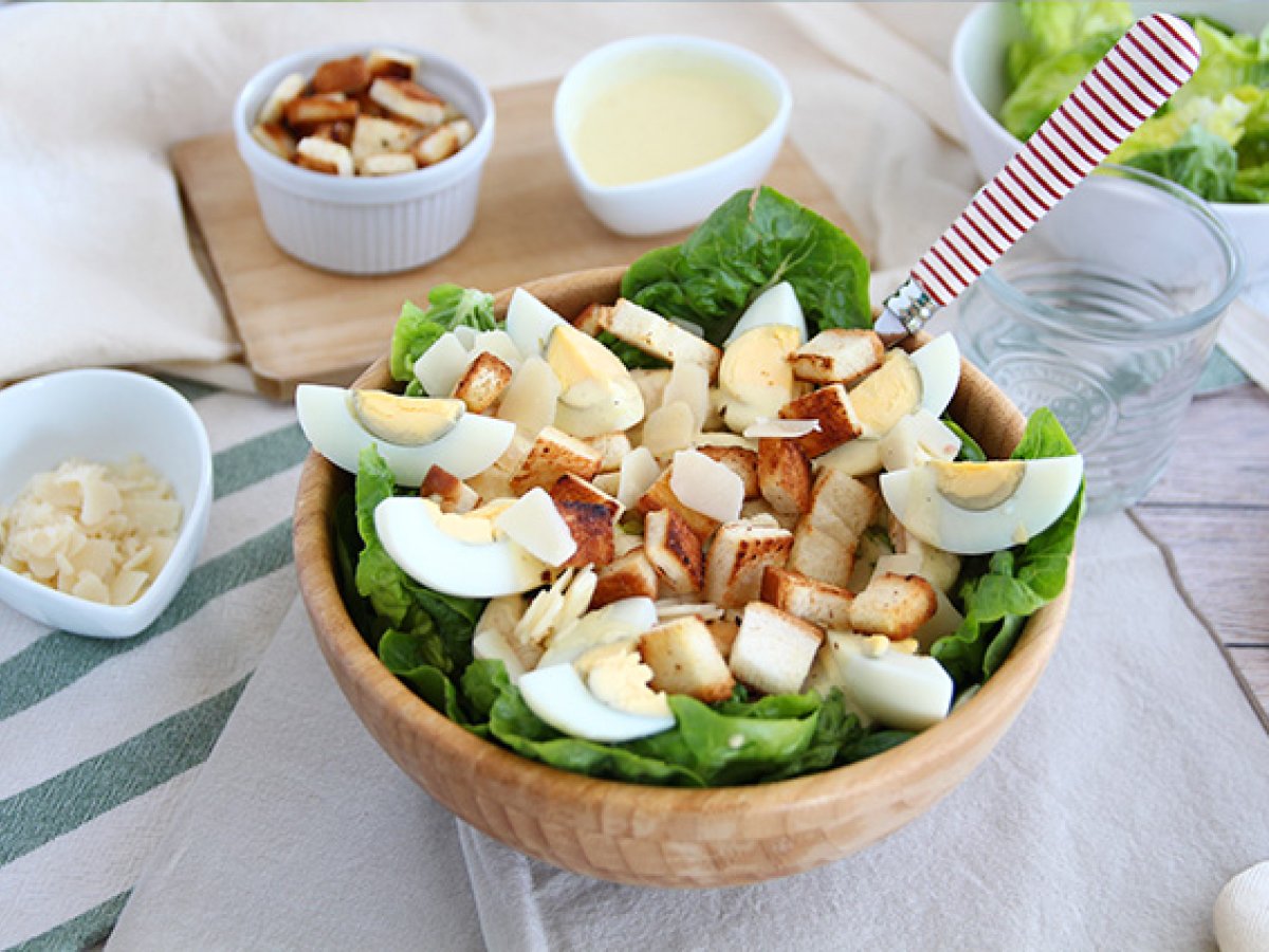 C'est faux!, la salade César n'a Jamais d'oeuf, ni de poulet! ah, ni citron. et je viens de là ou elle a été créé!