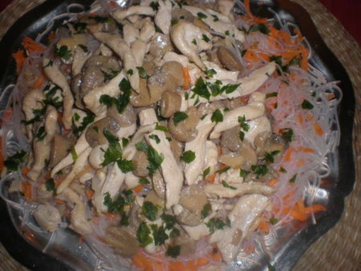 Salade chinoise à ma façon PrécédentSuivant Entréefacile20 min Envoyer cette recette à un ami Imprimer cette page Poser une question à l'auteur Publier votre photo de cette recette Cette salade n'est rien de particulier mais c'est bon et surtout ça rassasie! Ingrédients 2 1 paquet de vermicelles de soja 2 carottes (râpées) 1 boite de soja 1 boite de champignons 2 blancs de poulets (émincés) Sel Gingembre Ail Persil Huile Pour la sauce : 2 cuillères à soupe d'huile de sésame 3 cuillères à soupe de sauce soja 1 cuillère à soupe de miel 1/2 cuillère à café de gingembre 20 g de cacahuètes (hachées) 3 cuillères à soupe de vinaigre de riz Sel