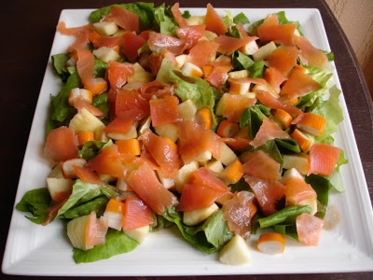 Salade composée au saumon fumé. PrécédentSuivant Entréefacile10 min144 Kcal Envoyer cette recette à un ami Imprimer cette page Poser une question à l'auteur Publier votre photo de cette recette Ingrédients 3 un fond de salade cinq bâtonnets de surimi deux belles tranches de saumon fumé deux mandarines une belle pomme, granny-smith si possible quelques crevettes décortiquées