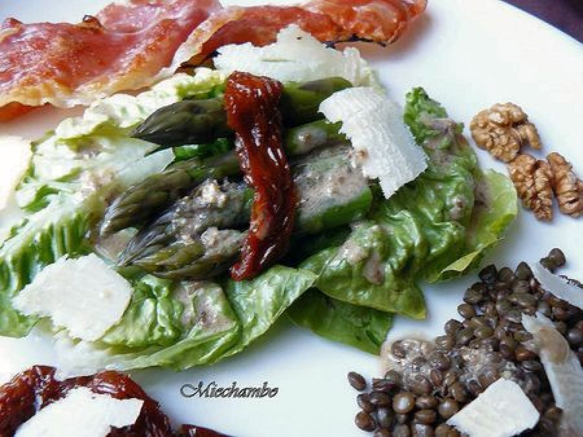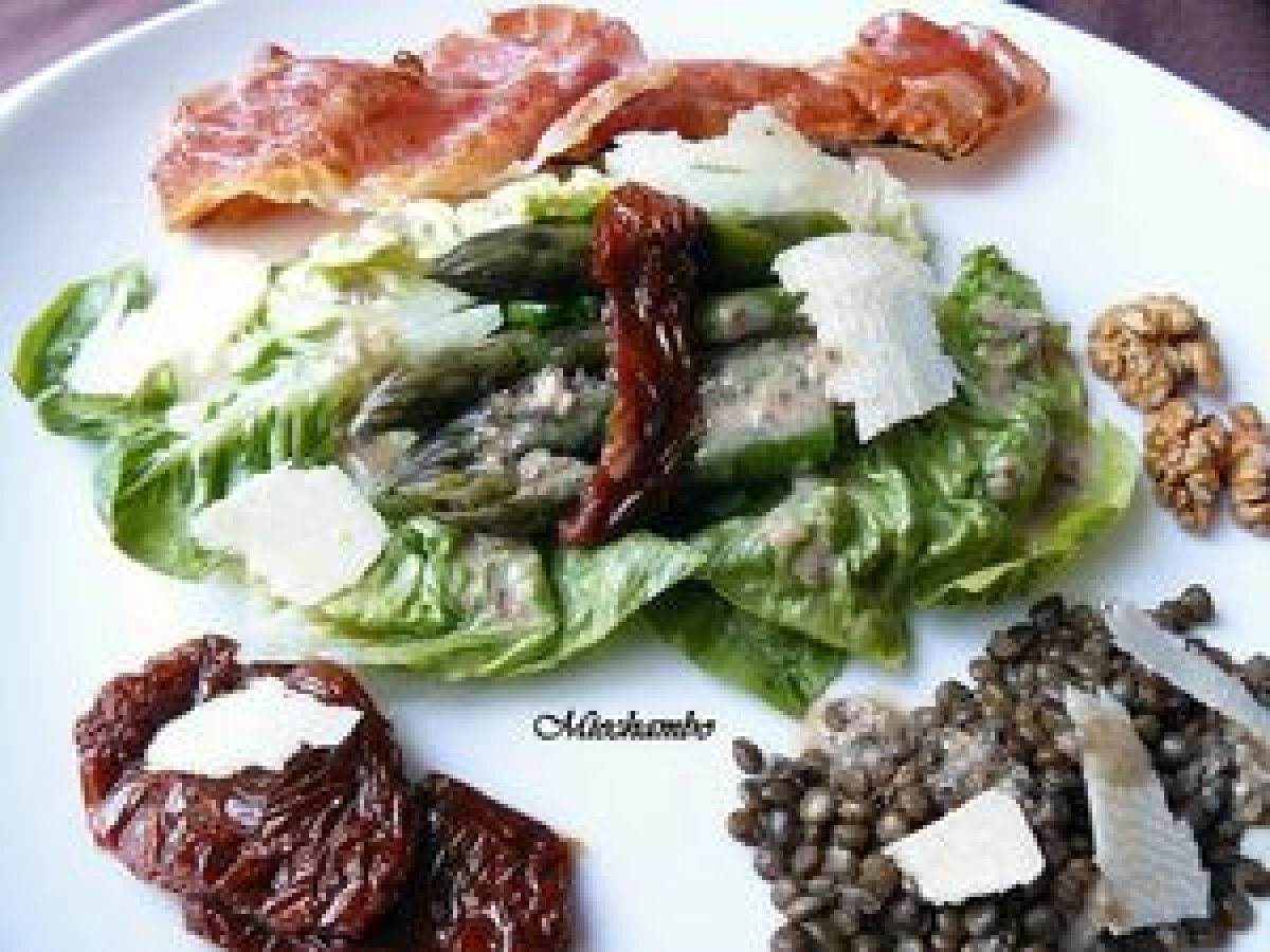 Salade d?asperges au parmesan, jambon serrano grillé et vinaigrette de lentilles PrécédentSuivant Entréefacile1 heure387 Kcal Envoyer cette recette à un ami Imprimer cette page Poser une question à l'auteur Publier votre photo de cette recette Ingrédients 2 Quelques feuilles de laitue Iceberg Une douzaine d'asperges vertes 4 tranches très fines de jambon Serrano 2 gousses d'ail 1 échalote 1 cuillère à soupe de moutarde 250 ml de bouillon de légumes 80 g de lentilles Vinaigre de Xérès Vinaigre Balsamique Huile d'olive Sel, poivre Pour la déco : Cerneaux de noix Tomates séchées à l'huile 2 cuillères à soupe de ciboulette ciselée