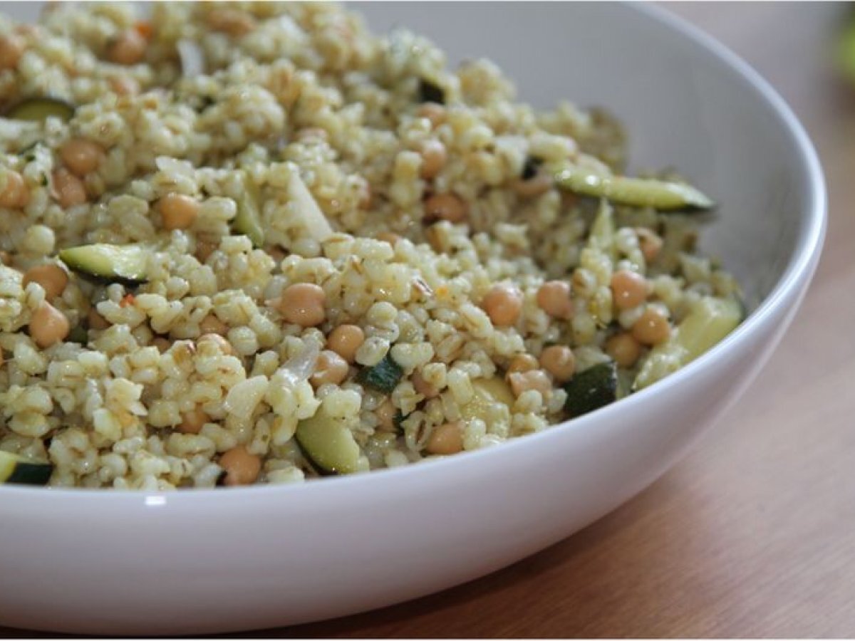 Salade d'orge aux courgettes et aux pois chiche votez maintenant Entréefacile20 min Envoyer cette recette à un ami Imprimer cette page Poser une question à l'auteur Publier votre photo de cette recette Ingrédients 4 300 g d'orge mondé 1 cube de bouillon de légumes, bio si possible 400 g de petites courgettes, épépinées et coupées en biais en morceaux de 0.5 cm 1 petite boîte de pois chiche, rincée et égouttée 8 gousses d'ail, pelées et coupées en fines tranches du piment en poudre, selon votre goût 1 botte de menthe fraîche 4 oignons nouveaux, propres et coupés en fines tranches 2 citrons bio ou non traités sel marin poivre noir du moulin