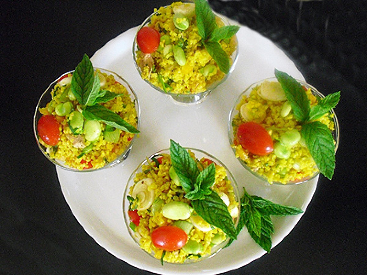 Salade de boulgour aux agrumes Entréemoyen25 min Envoyer cette recette à un ami Imprimer cette page Poser une question à l'auteur Publier votre photo de cette recette Entrée très fraiche Ingrédients 4 250 gr de boulgour 250 gr de tomates cerise 1 poivron 1 botte d'oignons nouveaux 1 poignée de fèves (fraîches décortiquées) 1 bouquet de menthe 1 boite de thon au naturel 2 citrons verts 1 orange (petite) 1 pamplemousse (petit) 1 cuillère à soupe de curcuma 10 gouttes de Tabasco 5 cuillères à soupe d'huile d'olive Sel Poivre
