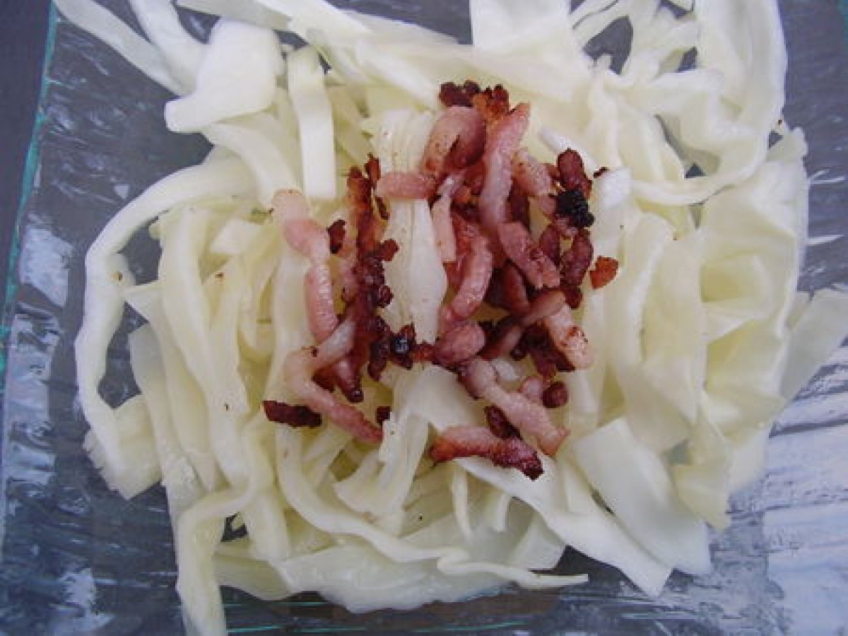 Très simple, on déguste une croustillante salade de chou blanc associée à des lardons !