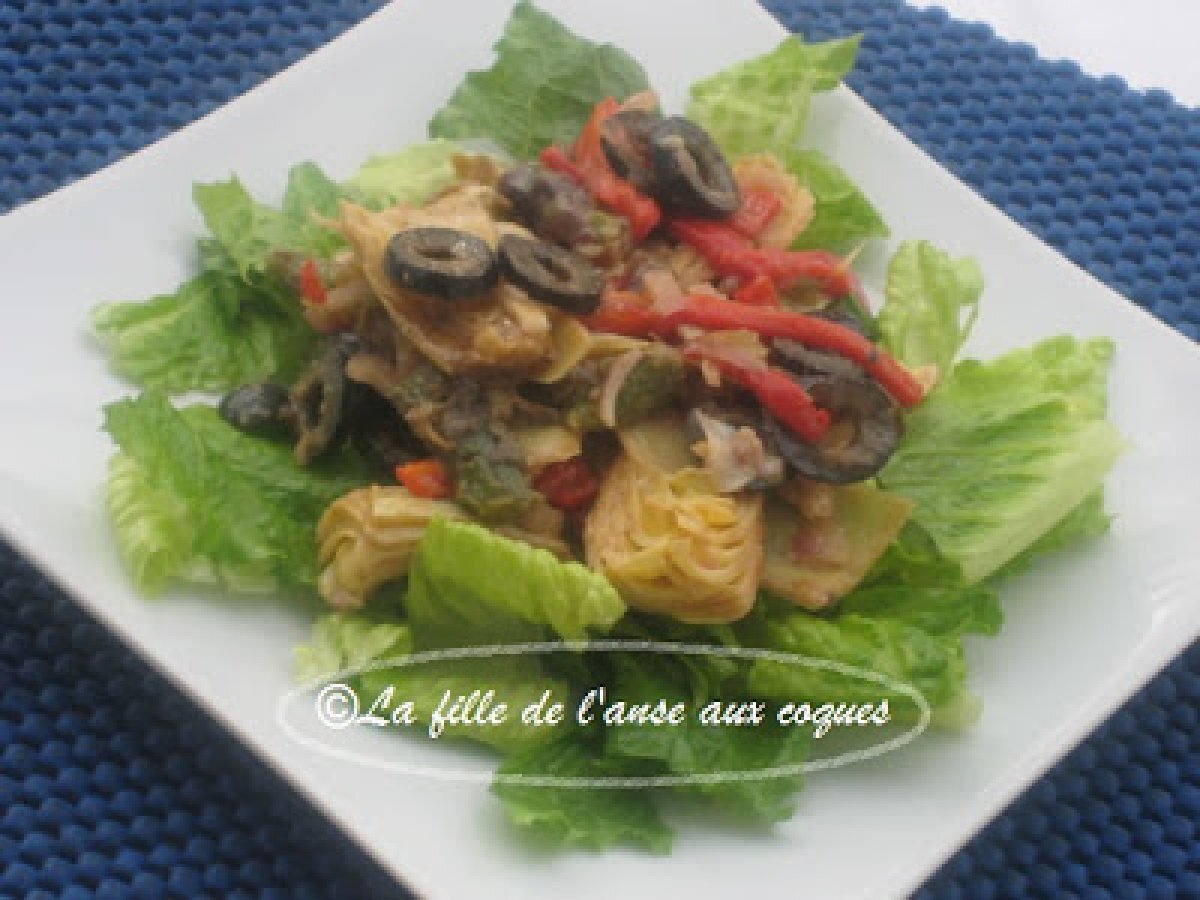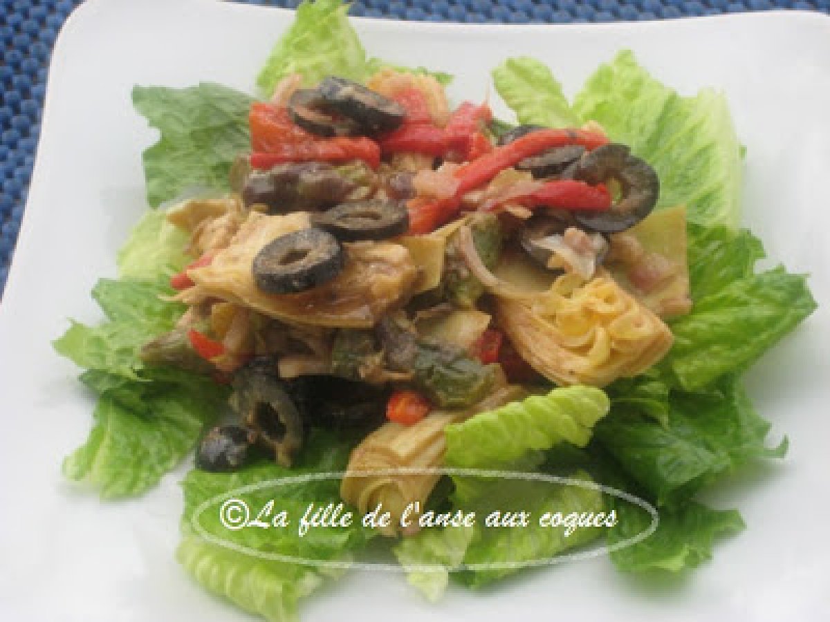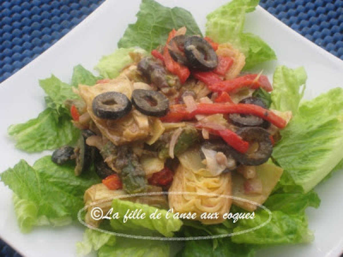 Salade de coeurs d'artichauts et de poivrons rôtis votez maintenant PrécédentSuivant Entréefacile15 min140 Kcal Envoyer cette recette à un ami Imprimer cette page Poser une question à l'auteur Publier votre photo de cette recette Ingrédients 4 1 boîte de coeurs d'artichauts bien rincés, égouttés. 3 poivrons rouges grillés et tranchés en fines lanières ½ échalote sèche hachée finement 12 olives noires dénoyautées, tranchées en rondelles 5 à 6 asperges cuites et hachées en tronçons Quelques feuilles de laitue de votre choix 2 à 3 cuillères à soupe de vinaigrette antipasto