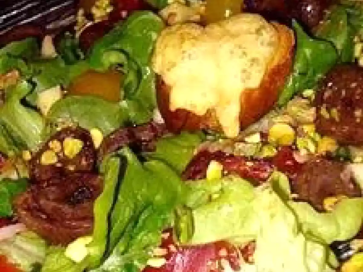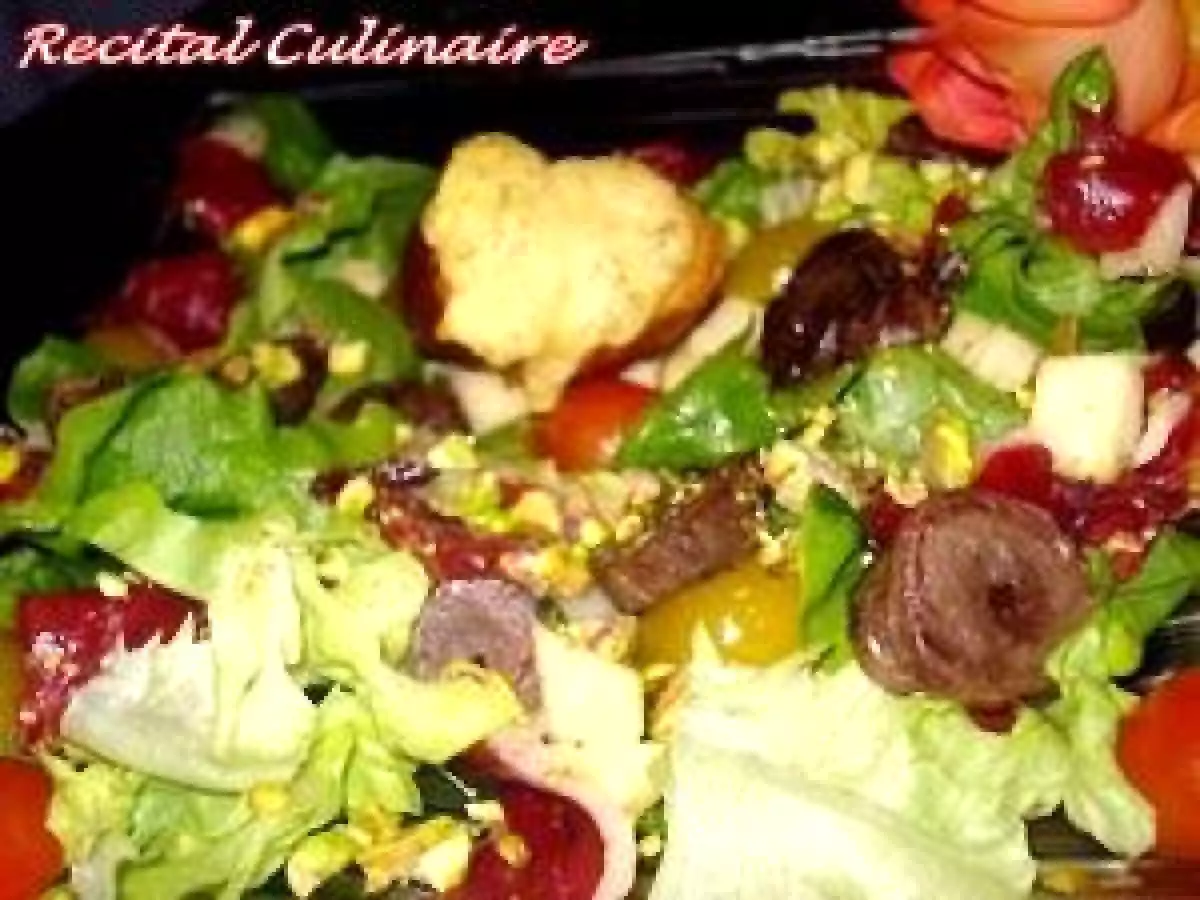 Salade de coeurs de canard confits aux pistaches, toasts au st-nectaire