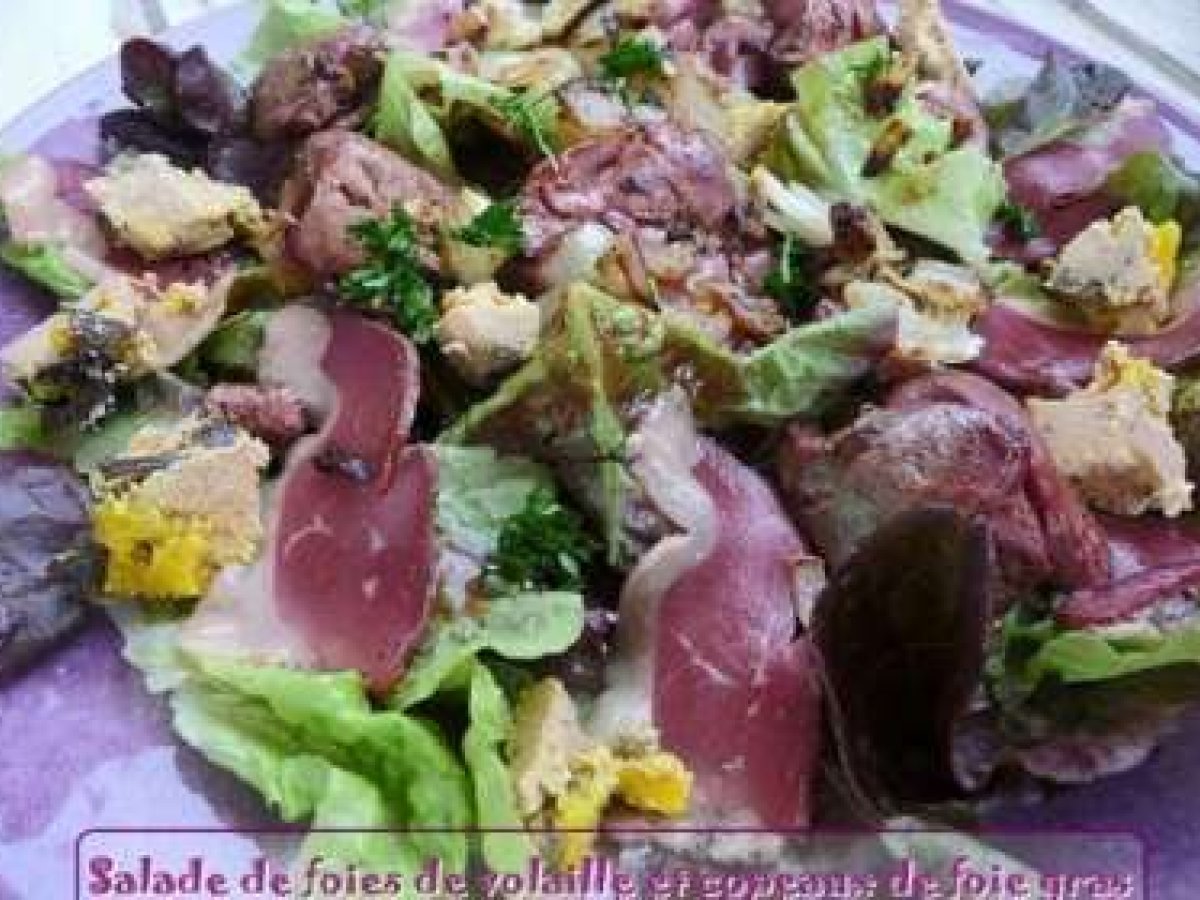 Salade de foies de volaille et copeaux de foie gras Entréefacile20 min Envoyer cette recette à un ami Imprimer cette page Poser une question à l'auteur Publier votre photo de cette recette Ingrédients 2 1 paquet de foies de volaille 1oignon 1cs dhuile dolive 1/2 paquet de magret séché 1/2 bloc de foie gras de la salade persil, ciboulette vinaigrette