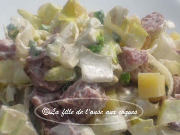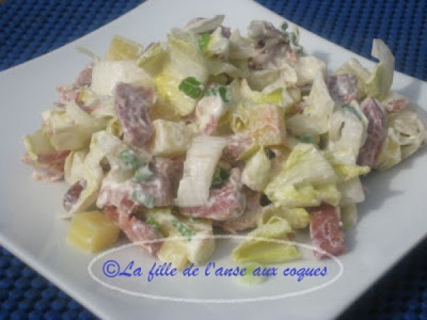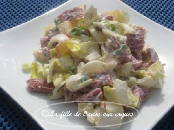 Salade de jambon, endives et emmenthal PrécédentSuivant Entréefacile15 min Envoyer cette recette à un ami Imprimer cette page Poser une question à l'auteur Publier votre photo de cette recette Ingrédients 4 4 belles grosses endives parées et nettoyées tranchées en rondelles Environ 1 ½ à 2 tasses de jambon en cubes ½ tasse de fromage emmenthal en cubes 1 oignon vert haché 2 à 3 cuillères à soupe de pignons grillés Sauce : 2 à 3 cuillères à soupe de mayonnaise 2 à 3 cuillères à soupe de yogourt nature Sel et poivre au goût Épices à salade au goût