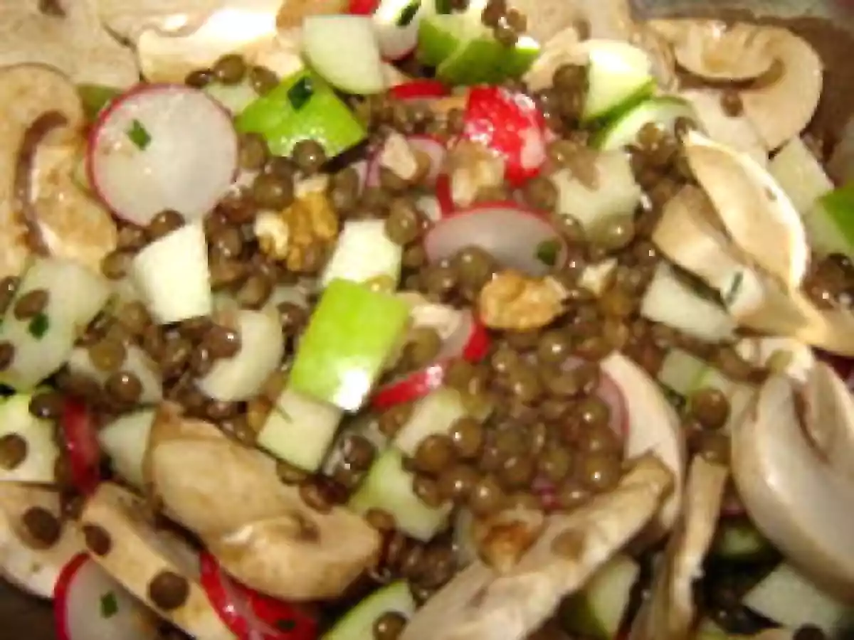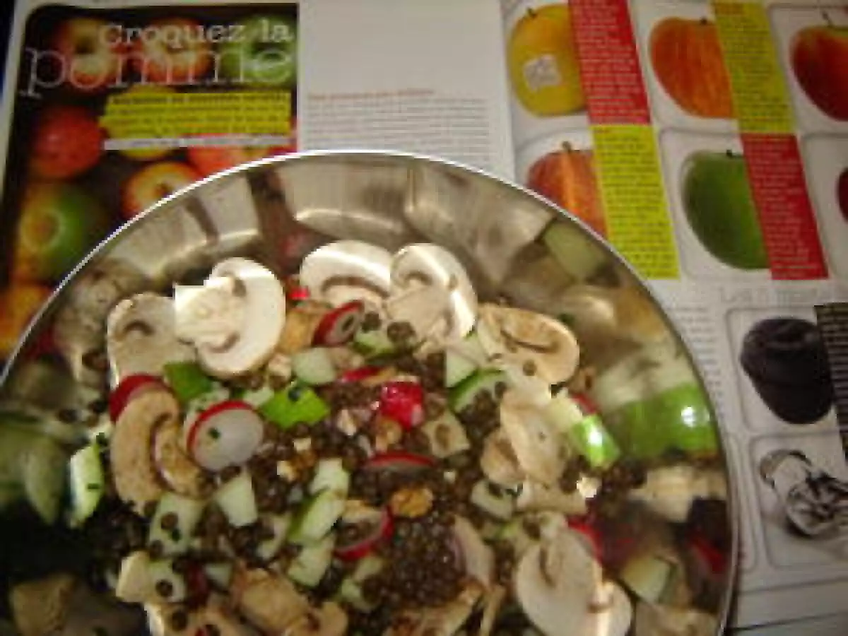 Salade de lentilles, pommes vertes, noix, champignons et radis