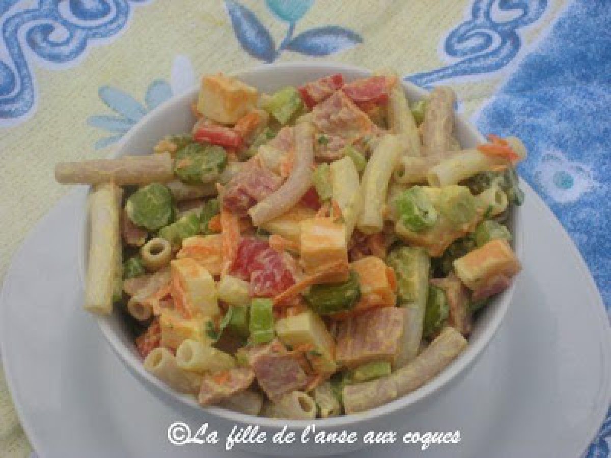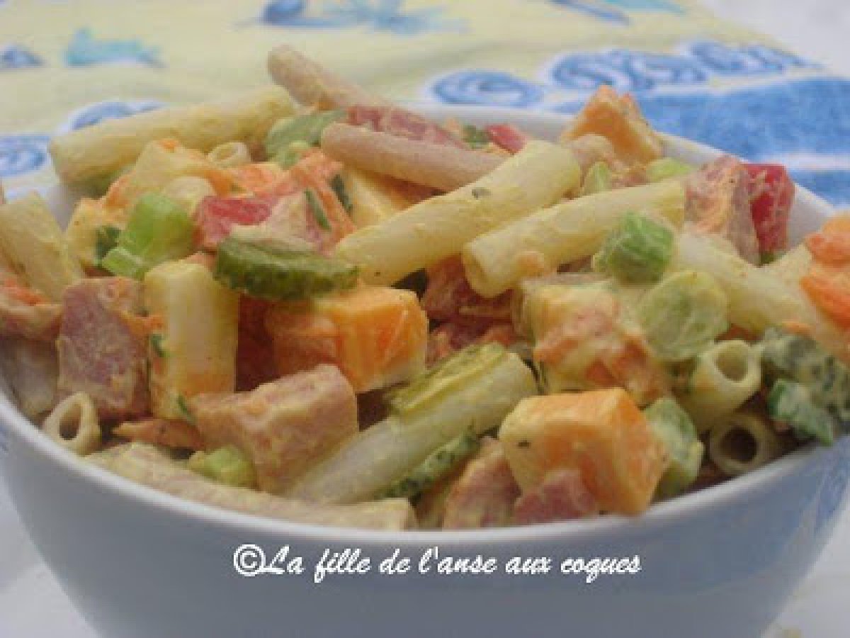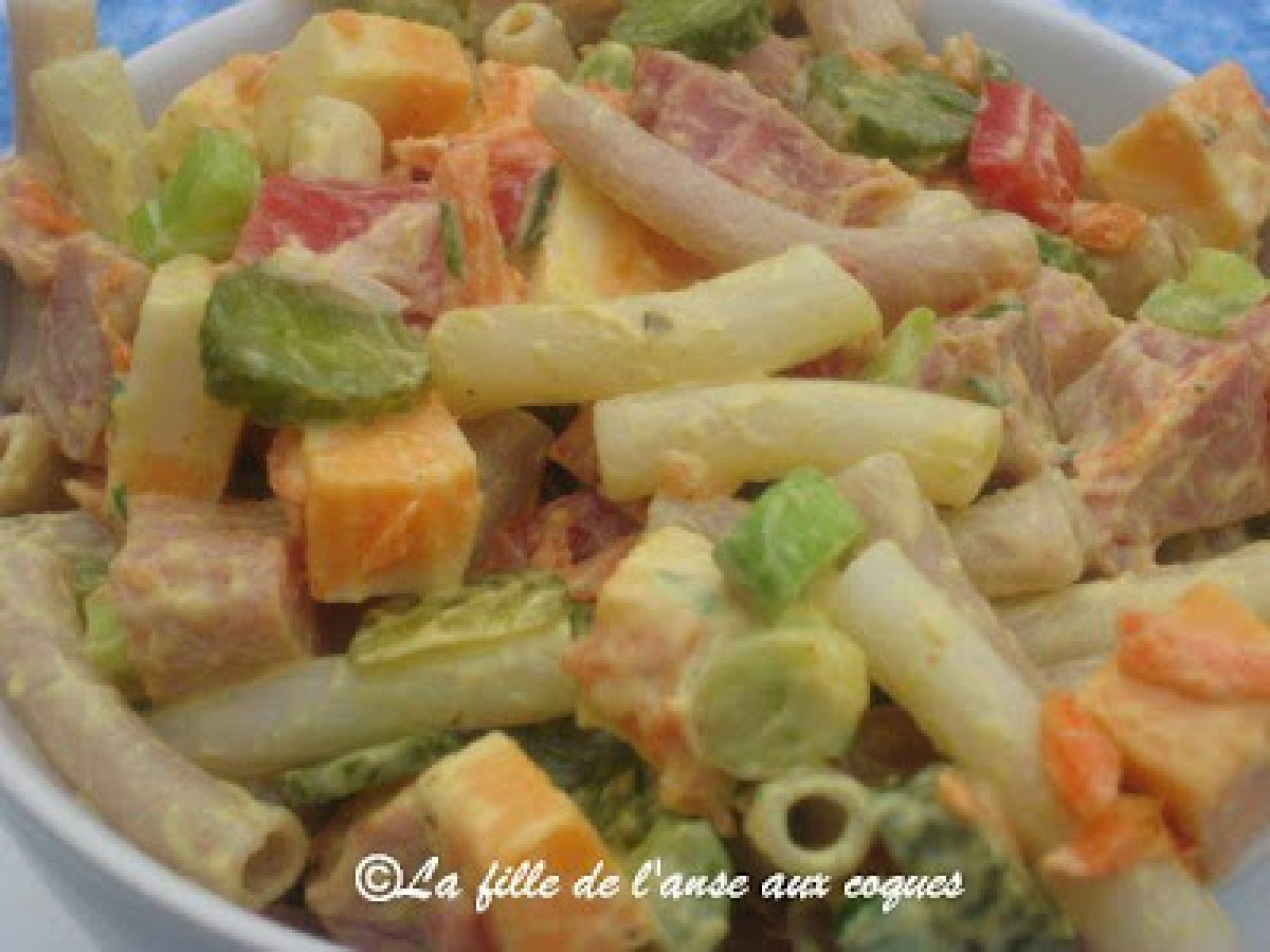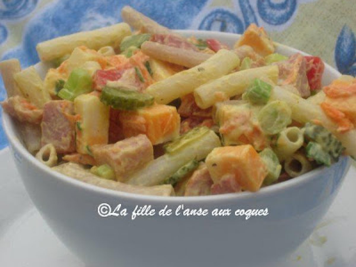 Salade de macaroni PrécédentSuivant Entréefacile25 min Envoyer cette recette à un ami Imprimer cette page Poser une question à l'auteur Publier votre photo de cette recette Ingrédients 8 3 tasses de macaroni non cuits 2 carottes 3 branches de céleri 1 poivron rouge 1 pot de cornichons sucrés 2 échalotes vertes 2 tasses de jambon en cubes 1 ½ tasse de cheddar en cubes Vinaigrette : 2/3 tasse de mayonnaise de mayonnaise +1/3 tasse de yogourt nature 2 cuillères à soupe de vinaigrette italienne du commerce 2 cuillères à soupe de moutarde jaune 2 cuillères à thé de poudre d'ail Ajout de ciboulette haché au goût