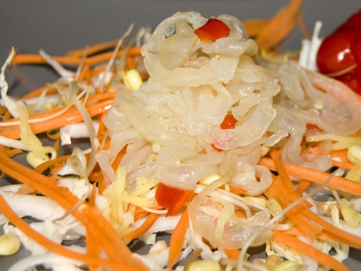 Salade de méduse. Entréemoyen10 min Envoyer cette recette à un ami Imprimer cette page Poser une question à l'auteur Publier votre photo de cette recette Ingrédients 4 1 sachet de méduses du chou chinois finement émincé des carottes râpées des germes de soja 5 cm de gingembre détaillé finement 1 gousse d’ail 1 pili pili du nuoc mam du jus de citron les épices jointes Facultatif : des cacahuètes concassées des oignons frits le petit sachet d’huile piquante qui fait partie du conditionnement