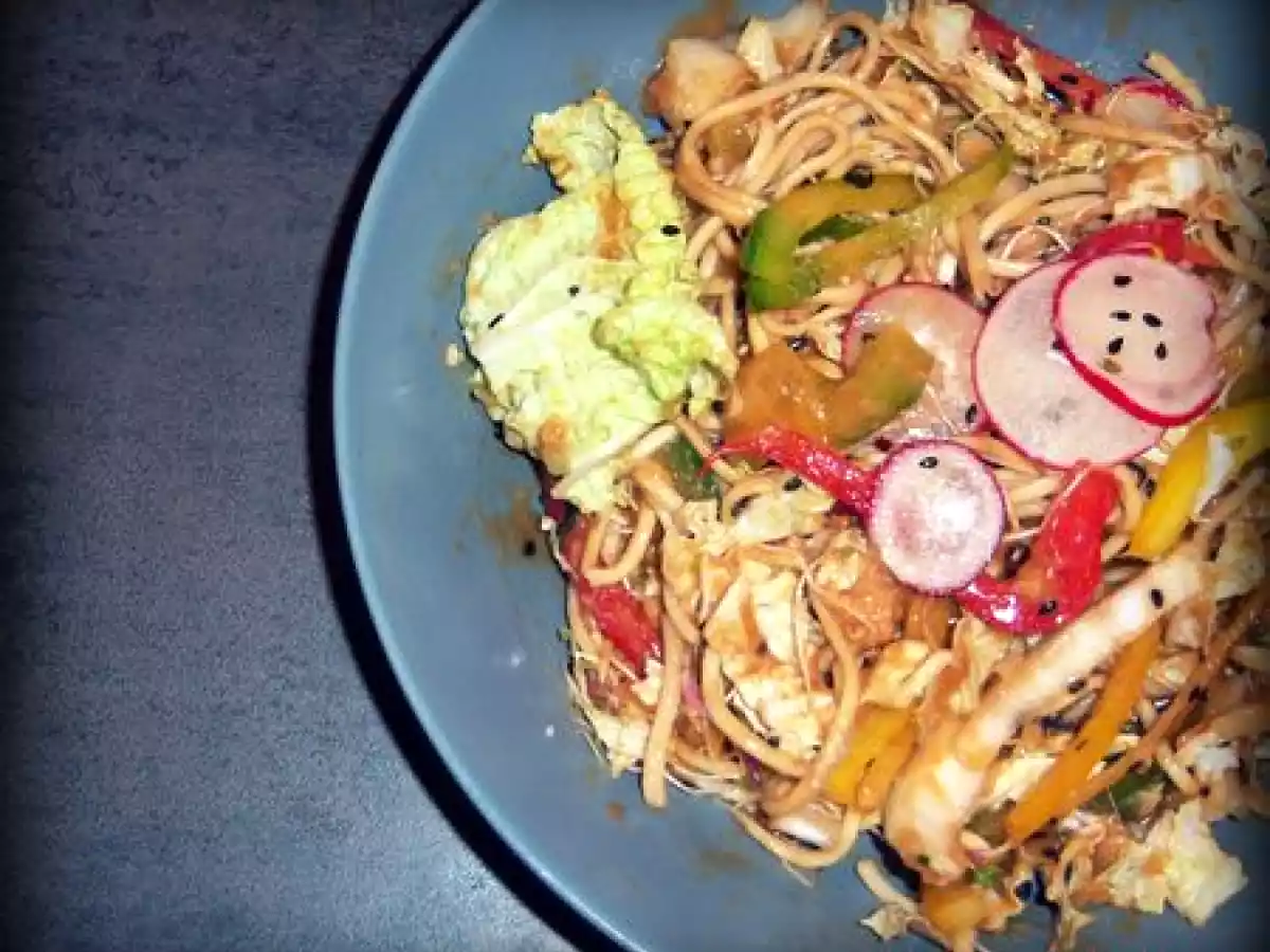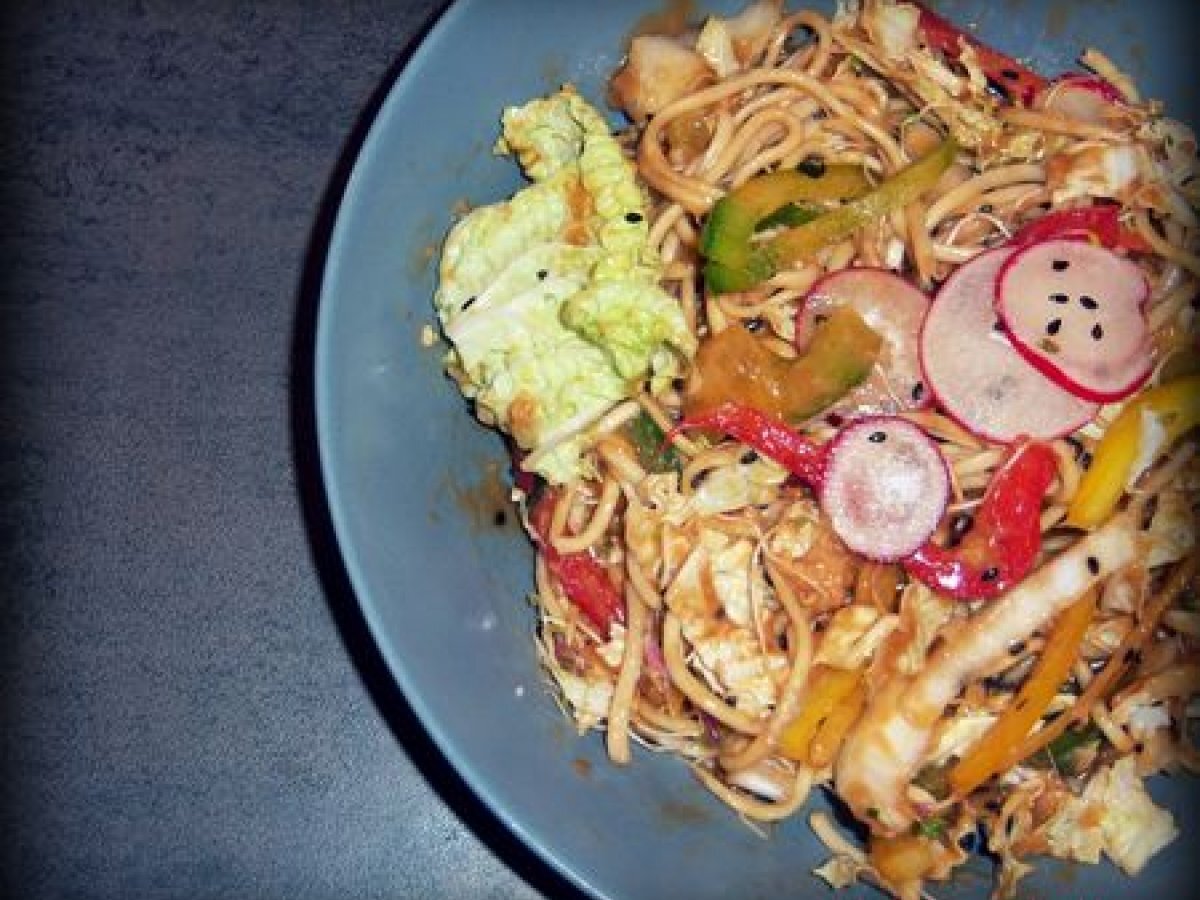 Salade de nouilles chinoises à la vinaigrette soja-cacahuète Entréefacile15 min Envoyer cette recette à un ami Imprimer cette page Poser une question à l'auteur Publier votre photo de cette recette Ingrédients 6 Pour la salade : 200 g de nouilles chinoises cuites 1/2 choux chinois finement coupé 1 poivron rouge finement émincé 1 poivron vert finement émincé 1 poivron jaune finement émincé 1 botte de radis coupée en fines rondelles une grosse poignée de graines germées 3 oignons verts émincés 1 concombre pelé et coupé en fines rondelles 2 cuillères à soupe de graines de sésame Pour la vinaigrette soja-cacahuètesoja-cacahuète : 8 cuillères à soupe d'huile végétale 2 cuillères à soupe de beurre de cacahuète 8 cuillères à soupe de sauce soja 1 cuillère à soupe d'huile de sésame 2 cuillères à café de purée de piment le jus d'un citron vert 2 cuillères à soupe de vinaigre de riz de la coriandre hachée