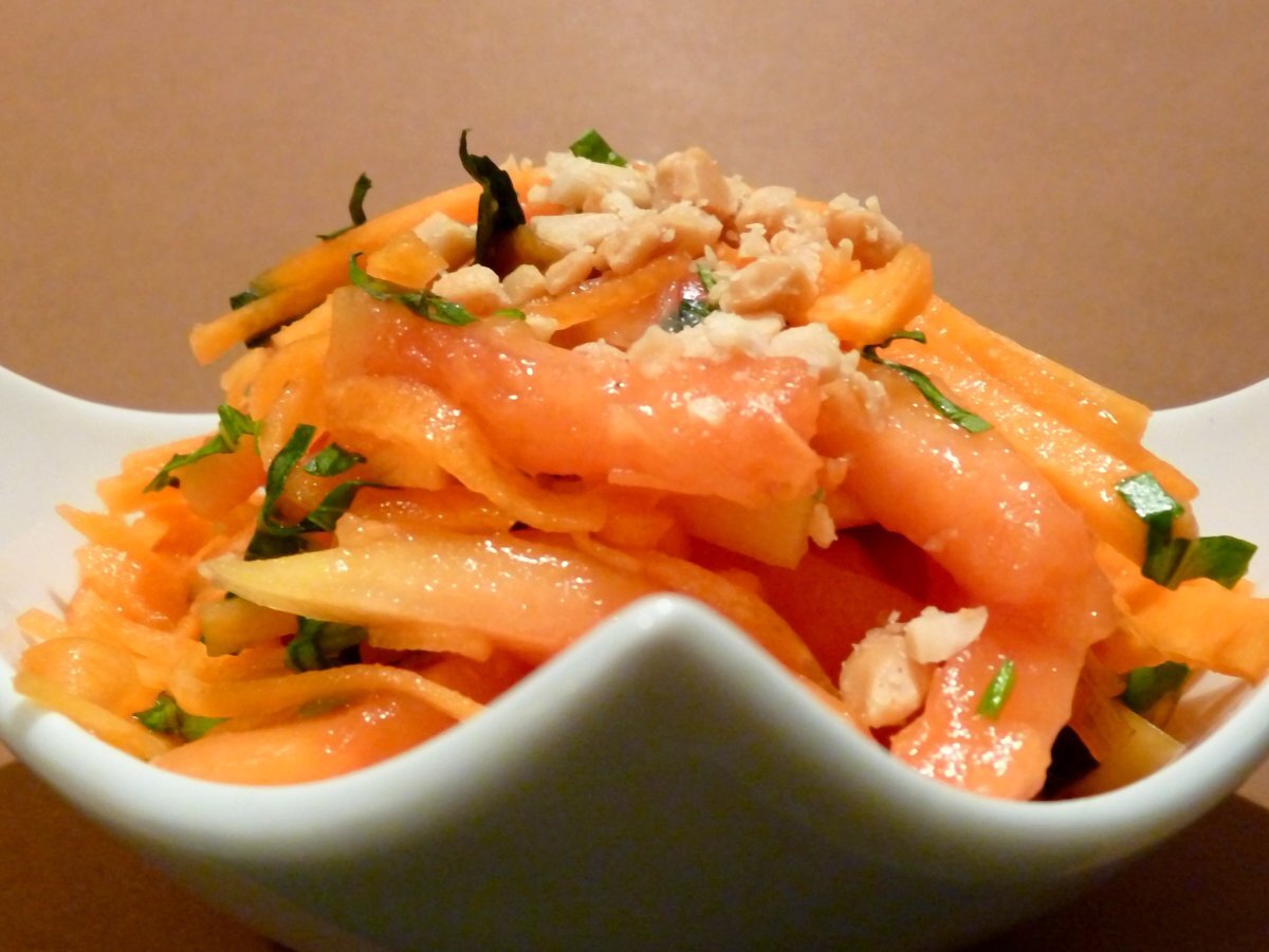 L'histoire de cette recette est assez rigolote. Je cherchais initialement réaliser une salade thaïlandaise à base de papaye verte pour un repas chez des amis. un primeur m'a vendu une papaye non verte. J'ai quand même réalisé cette recette. Au final un vrai régal !!!