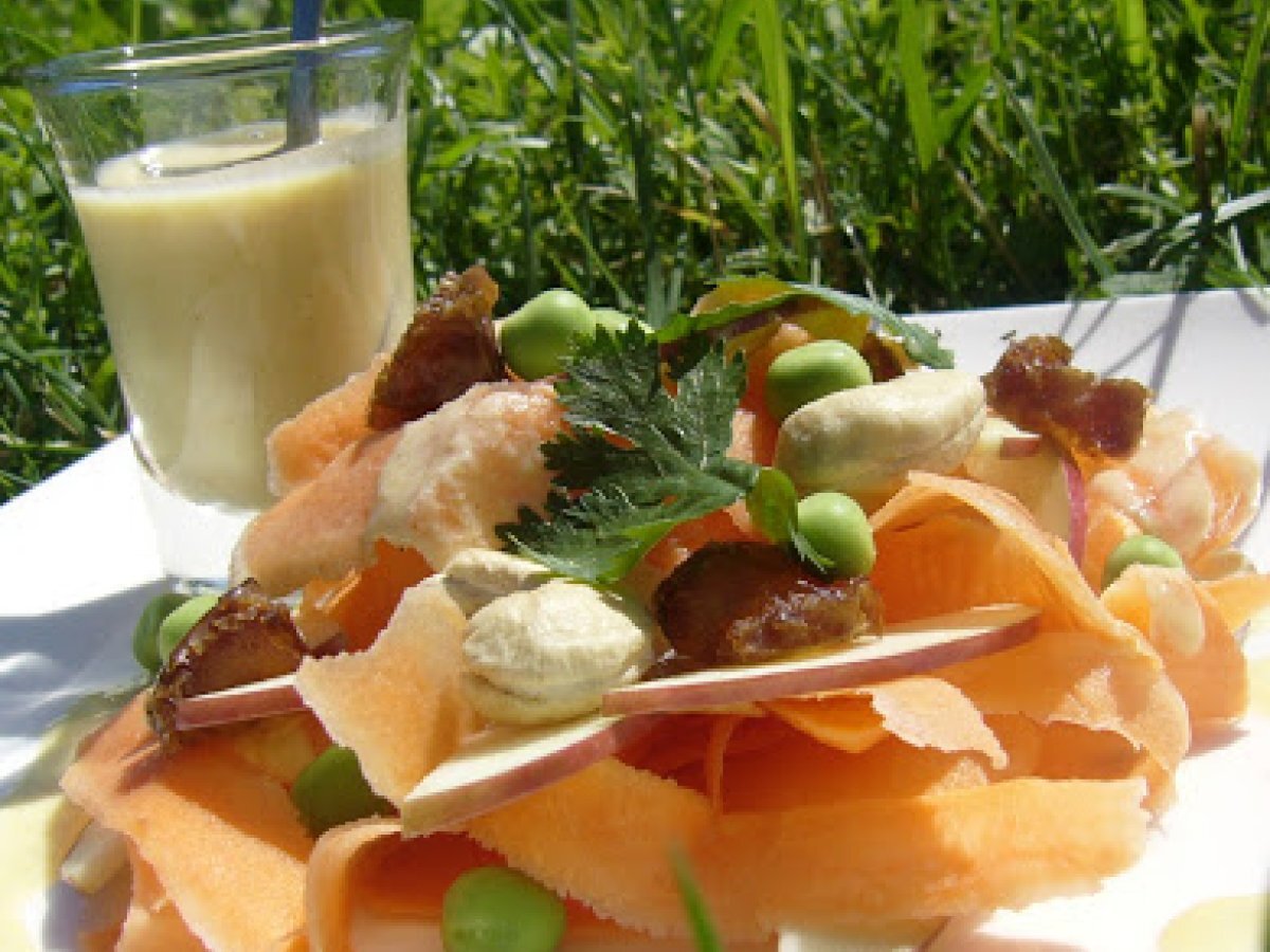 Une belle salade très fortement inspirée de la Salade de patate douce et carotte aux deux fruits, sauce cajou-curry