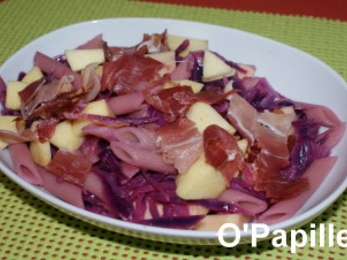 Salade de pâtes au chou rouge Entréefacile15 min658 Kcal Envoyer cette recette à un ami Imprimer cette page Poser une question à l'auteur Publier votre photo de cette recette Ingrédients 4 un demi chou rouge 3 pommes 200g de jambon sec 250g de pennes 4 cuillères à soupe d'huile de colza 4 cuillères à soupe de vinaigre de cidre 1 cuillère à soupe de sucre, sel et poivre Coût estimé: 13.18Euros€ (3.29€/part)