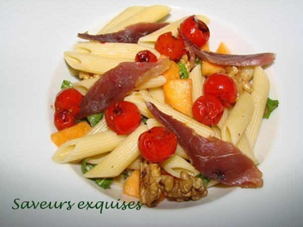 Salade de penne , magret séché et melon Entréefacile30 min Envoyer cette recette à un ami Imprimer cette page Poser une question à l'auteur Publier votre photo de cette recette Ingrédients 4 des pennes (environ 250 g pour 4 pers selon la recette) ou selon votre appétit 1/2 magret séché maison prétranché 1/2 melon de cavaillon 30 g de cernaux de noix 1 barquette de tomates cerises quelques feuilles de basilic 1 poignée de roquette 5 cl d'huile d'olive 1 cs condiment ou vinaigre balsamique blanc sel et poivre