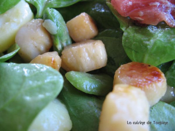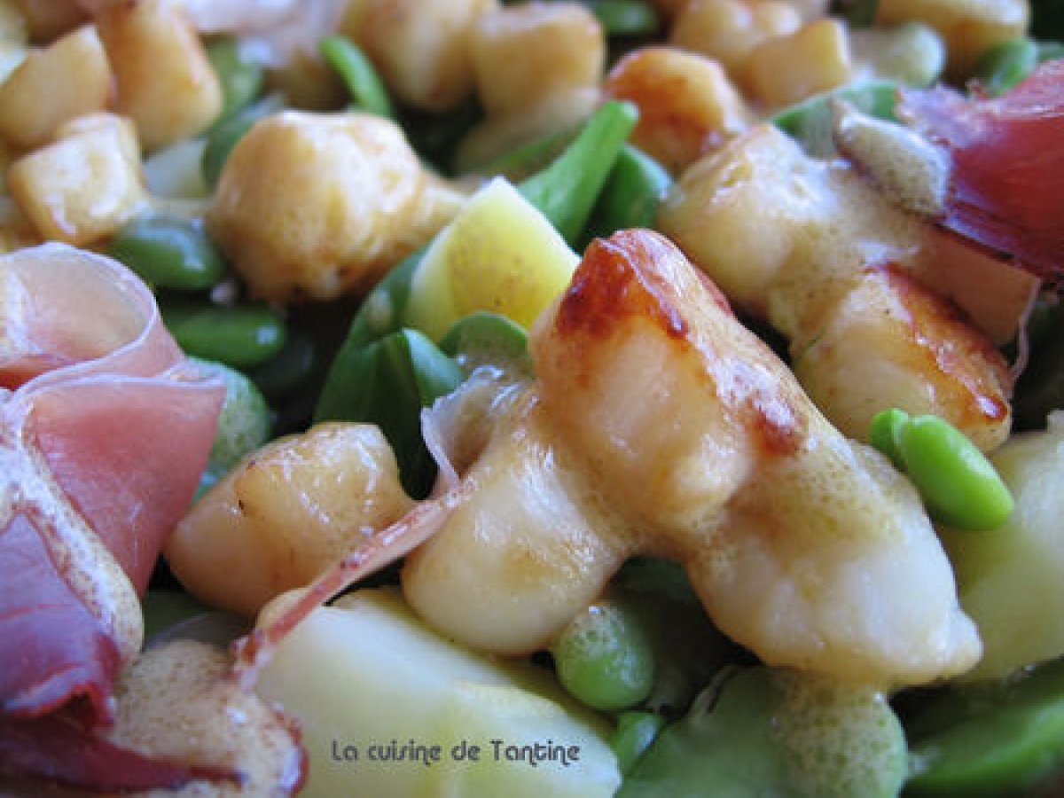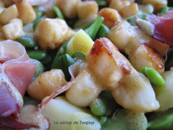 Salade de pommes de terre et de pétoncles votez maintenant PrécédentSuivant Entréefacile1 heure365 Kcal Envoyer cette recette à un ami Imprimer cette page Poser une question à l'auteur Publier votre photo de cette recette Ingrédients 4 200 g de petites pommes de terre primeur 300 g de noix de pétoncles 150 g de fèves pelées 1 poignée de pousses d'épinards 2 fines tranches de lard 1 cuillères à soupe d'huile d'olive sel poivre du moulin 1 cuillères à soupe de vinaigre de xérès 1 cuillères à café de moutarde de Dijon 5 cuillères à soupe d'huile d'olive parfumée à la truffe Coût estimé: 13.7Euros€ (3.43€/part)