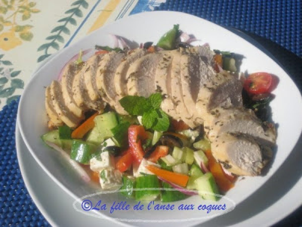 Salade de poulet à la grecque Entréefacile27 min409 Kcal Envoyer cette recette à un ami Imprimer cette page Poser une question à l'auteur Publier votre photo de cette recette Ingrédients 4 Pour la marinade : 4 poitrines de poulet, la peau enlevée Le jus de deux citrons 1 cuillère à soupe (15 ml) origan haché (mis 1 cuillère à thé/5 ml d'origan séché) 2 cuillères à thé (10 ml) de grains de coriandre (légèrement écrasés) Sel poivre au goût 1 cuillère à soupe (15 ml) d'huile de canola (pépins de raisin) Pour la salade : 20 tomates cerises 2 branches de céleri ½ poivron rouge ½ poivron jaune (orange) ½ concombre (concombre anglais) 1 oignon rouge ½ tasse (125 ml) d'olives noires ½ livre (250 g) de fromage feta coupé en cubes 3 cuillères à soupe (45 ml) huile d'olive 2 cuillères à soupe (30 ml) de menthe ciselée Ajout: jus de citron au service Coût estimé: 11.87Euros€ (2.97€/part)