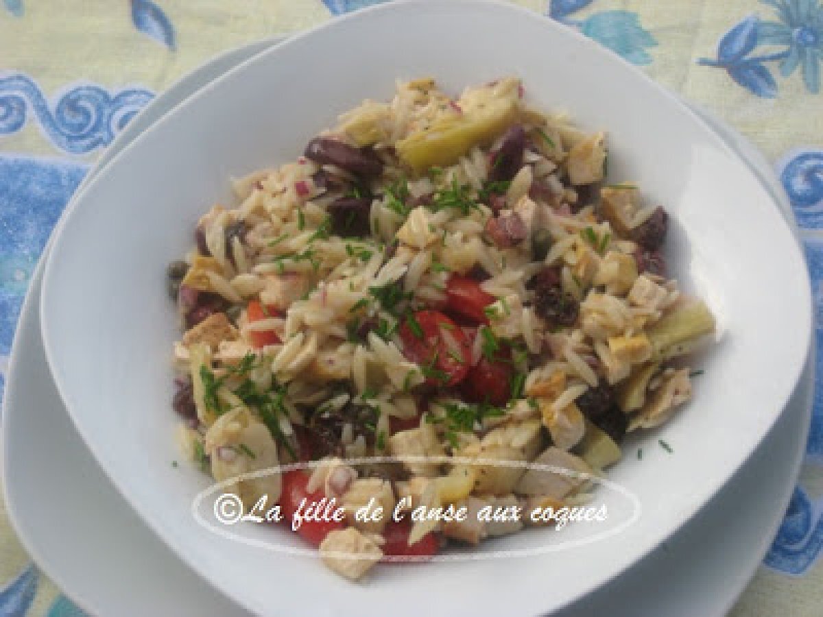 Salade de poulet à la méditerranéenne votez maintenant Entréefacile22 min Envoyer cette recette à un ami Imprimer cette page Poser une question à l'auteur Publier votre photo de cette recette Ingrédients 4 6 cuillères à soupe (90 ml) d'huile d'olive 2 cuillères à soupe + 2 cuillères à thé (40 ml) de vinaigre balsamique blanc 2 cuillères à thé (10 ml) d?origan séché ½ cuillère à soupe (7,5 ml) de jus de citron frais ½ cuillère à soupe (7,5 ml) de moutarde de Dijon 1 gousse d'ail au presse-ail Sel poivre 3 tasses de poulet cuit en dés ½ tasse (90 g) d'orzo (pâte sèche) 1 tasse (250 ml) de tomates cerises coupées en deux 1 pot de 6 oz (168 ml) de coeurs d'artichauts marinés, bien égouttés ½ tasse (125 ml) d'olives Kalamata hachées 1/3 tasse (80 ml) de raisins secs 1 ½ cuillères à soupe (22,5 ml) de câpres égouttées Garniture : ciboulette fraîche hachée finement au goût