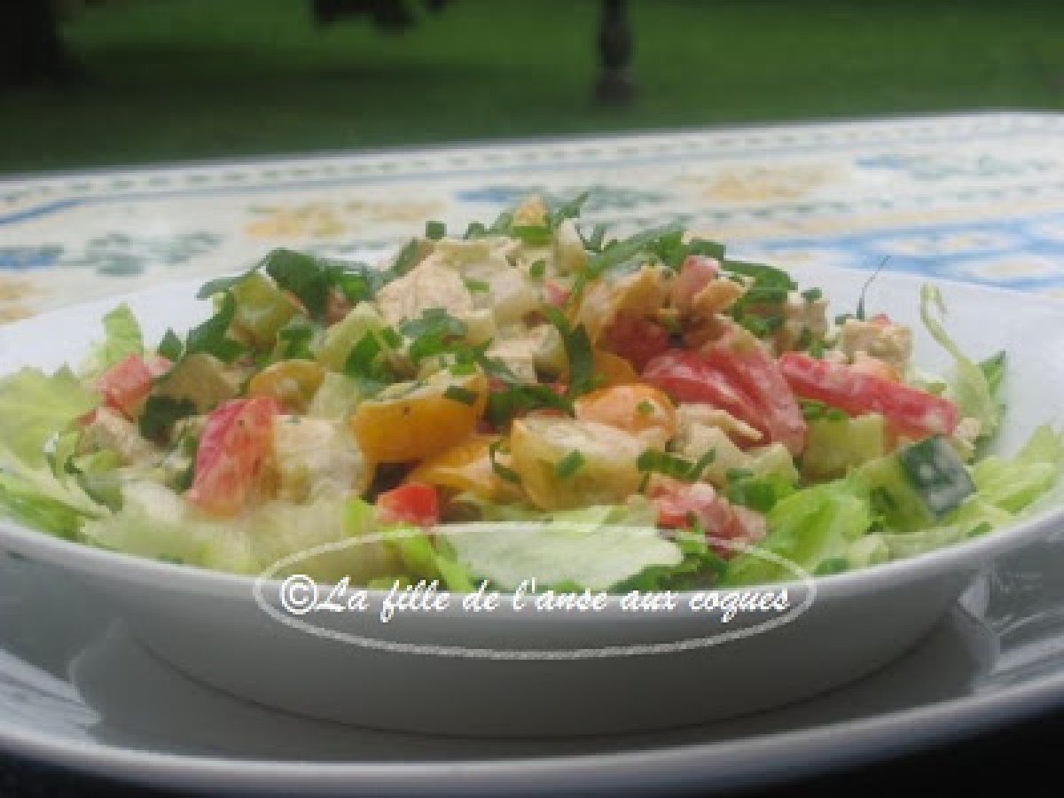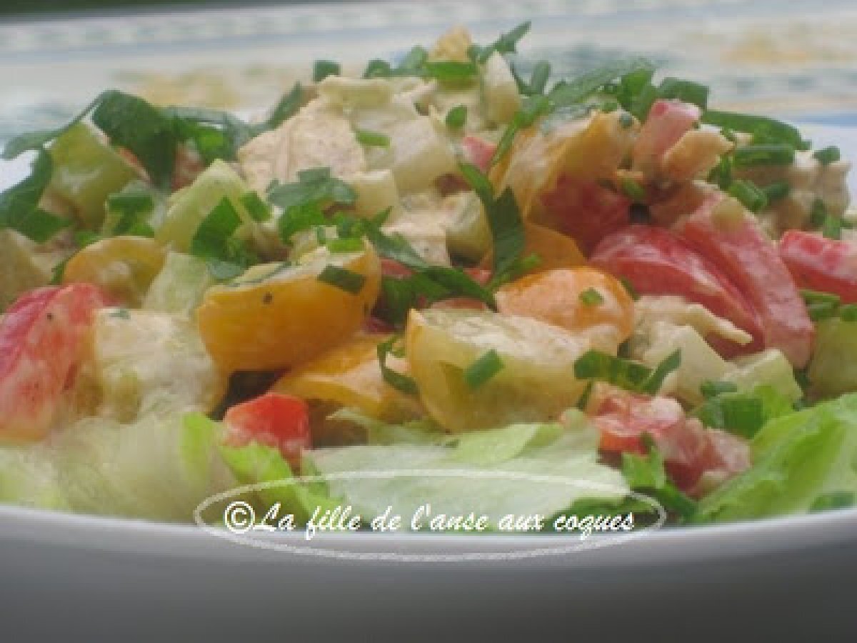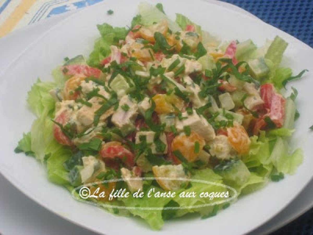 Salade de poulet, tomates, laitue, poivron PrécédentSuivant Entréefacile15 min489 Kcal Envoyer cette recette à un ami Imprimer cette page Poser une question à l'auteur Publier votre photo de cette recette Ingrédients 4 Un reste de poulet grillé 1 poivron rouge 2 tasses de petites tomates poires jaunes Environ 8 tasses de laitue de votre choix déchiquetée ½ concombre anglais ¼ tasse d'oignon espagnol haché Un petit contenant de yogourt nature 1 cuillère à soupe de moutarde douce ciboulette et persil plat ciselés au goût Sel et poivre Coût estimé: 18.2Euros€ (4.55€/part)