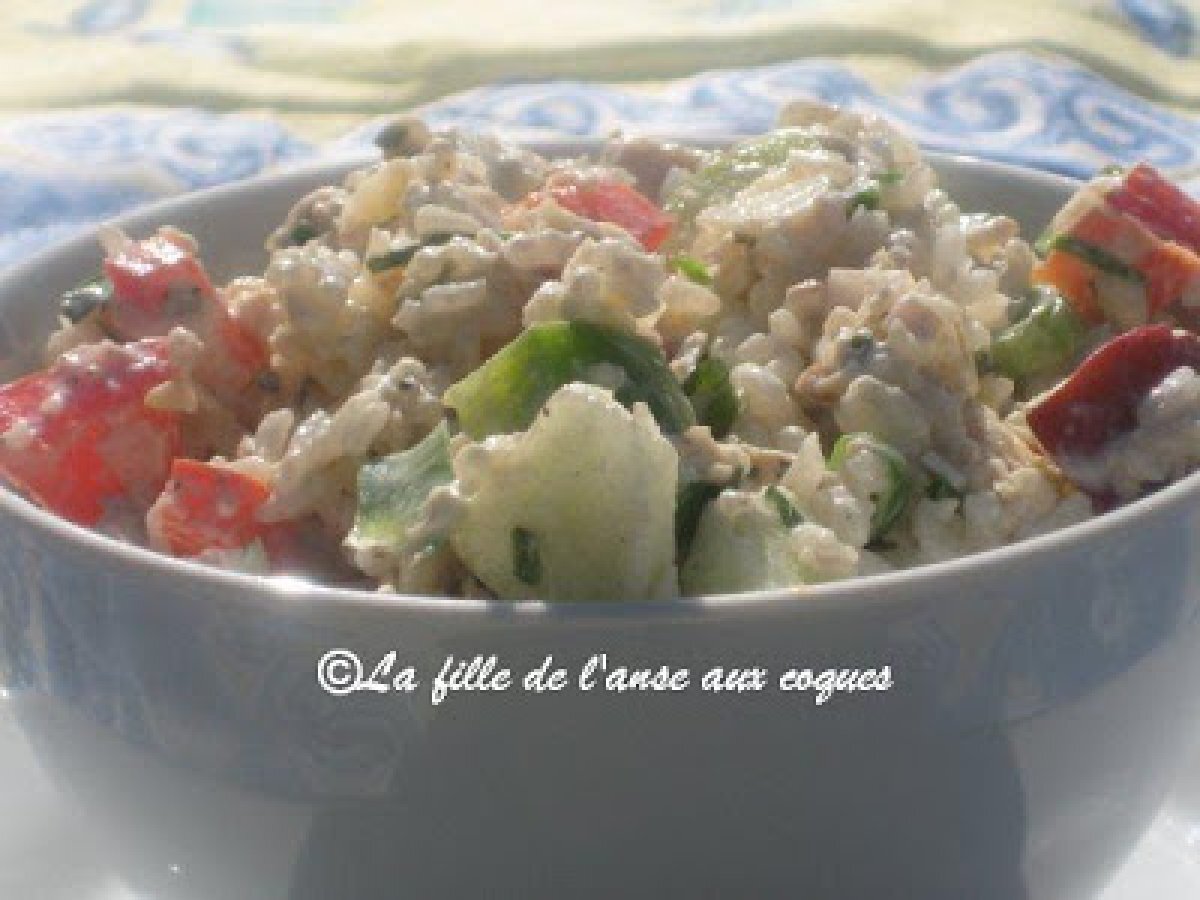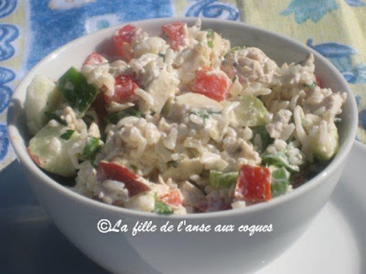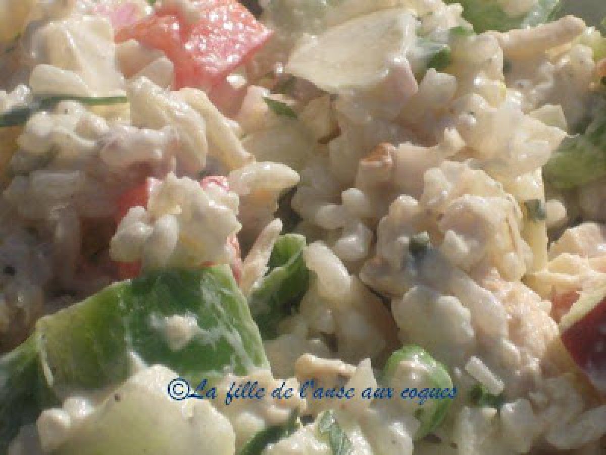 Salade de riz au poulet, pommes et noix PrécédentSuivant Entréefacile15 min Envoyer cette recette à un ami Imprimer cette page Poser une question à l'auteur Publier votre photo de cette recette Une salade très fraîche en bouche, fruitée et au goût légèrement acidulé. Ingrédients 4 Pour la vinaigrette: 125 ml de yogourt nature 85 ml de mayonnaise 30 ml de jus de citron 30 ml de persil haché 15 ml d'estragon haché Pour la salade: 2 pommes vertes Granny Smith 375 ml de poulet cuit et coupé en dés 500 ml de riz cuit 1 oignon haché 1 poivron rouge coupé en dés 60 ml de noix de Grenoble hachées 60 ml d'amandes effilées Sel et poivre au goût Ajout de ciboulette fraîche hachée au goût