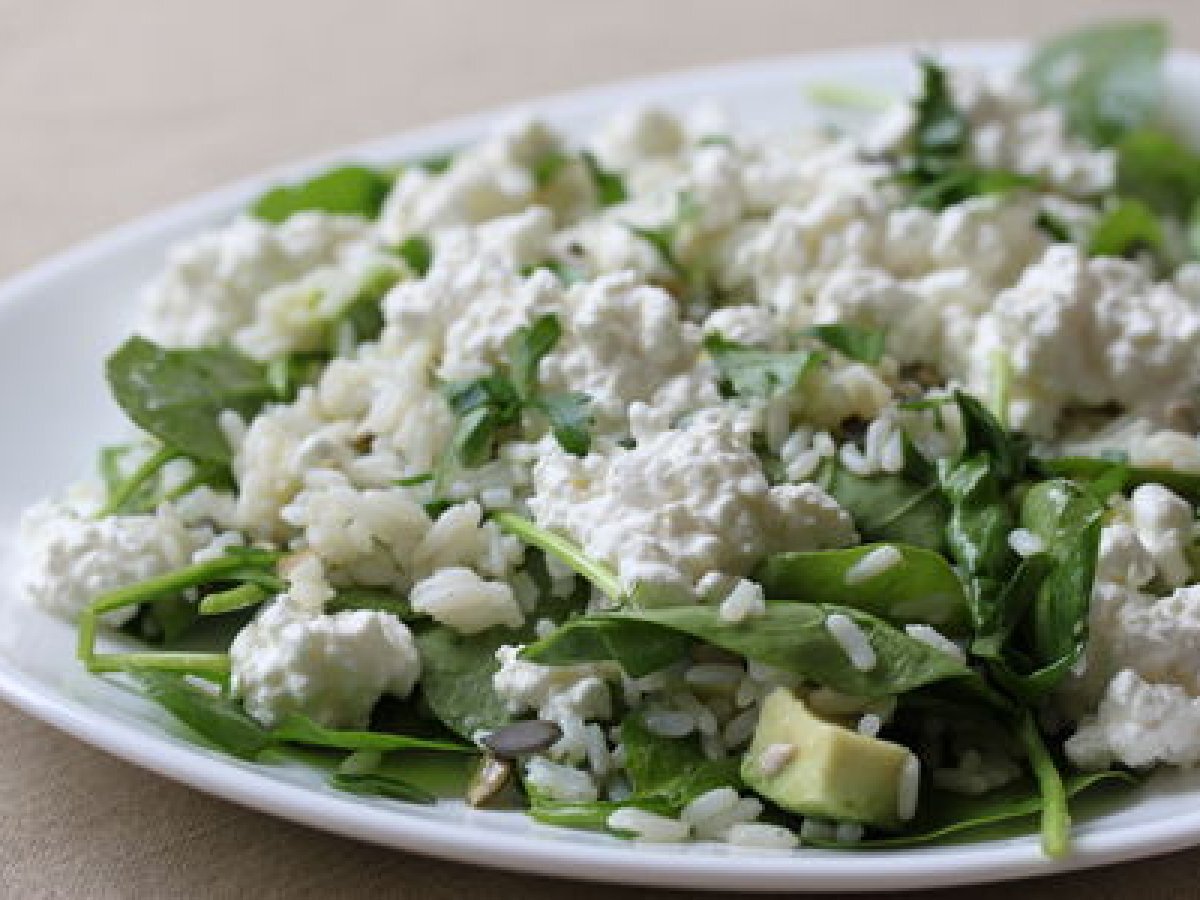 Salade de riz aux pousses d'épinard, avocat et cottage cheese