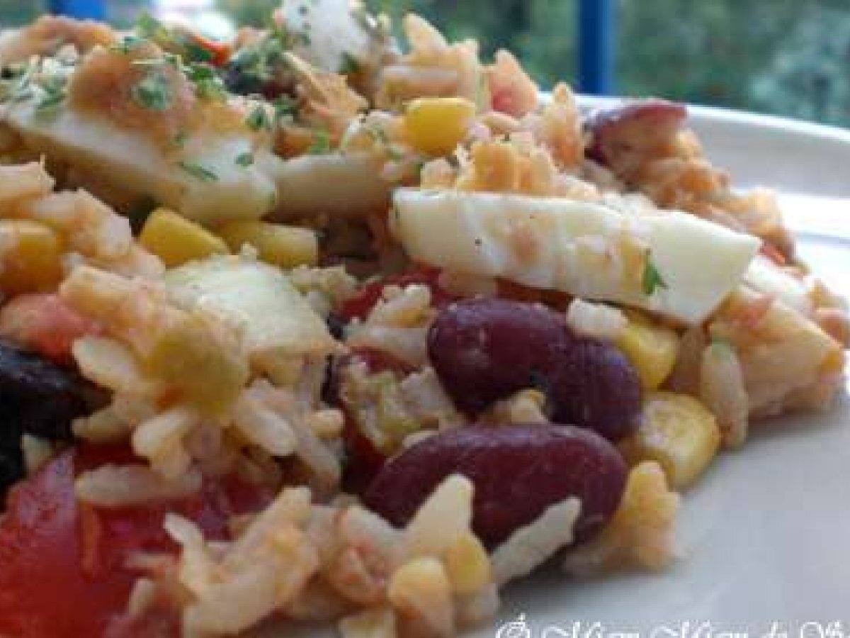 Salade de riz thaï & soja & lentilles à la mexicaine Entréefacile25 min Envoyer cette recette à un ami Imprimer cette page Poser une question à l'auteur Publier votre photo de cette recette Ingrédients 6 Riz Thaï & Soja & lentilles Il n'est pas toujours évident d'allier " équilible alimentaire" et "Miam Miam" des enfants Voici une petite variante de salade de riz riche en céréales (riz, soja, lentilles rouges) que j'aime faire et qui passe très bien chez les Petits & grands 1 Bol (bien rempli) de mélange Riz -Soja-Lentilles 2 boites de thon à la mexicaine ( thon, maïs, haricots rouges etc...) 3 oeufs 3 tomates 1 petite boite de maïs persil 1 échalottes 2càs d'huile d'olive 1 càs de vinaigre sel et poivre
