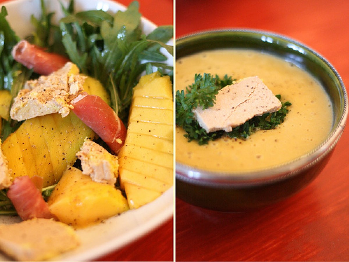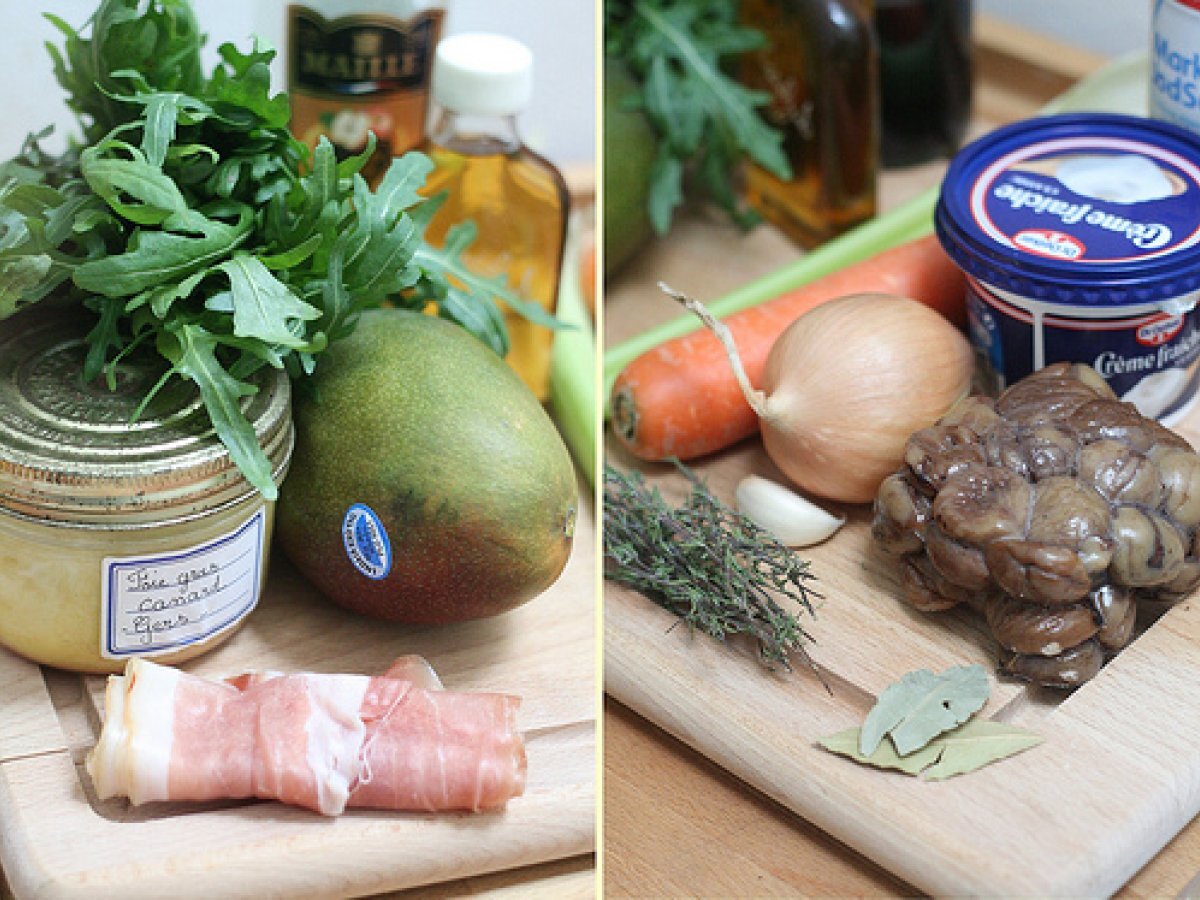 Salade de roquette à la mangue & au foie gras ou velouté de châtaigne?