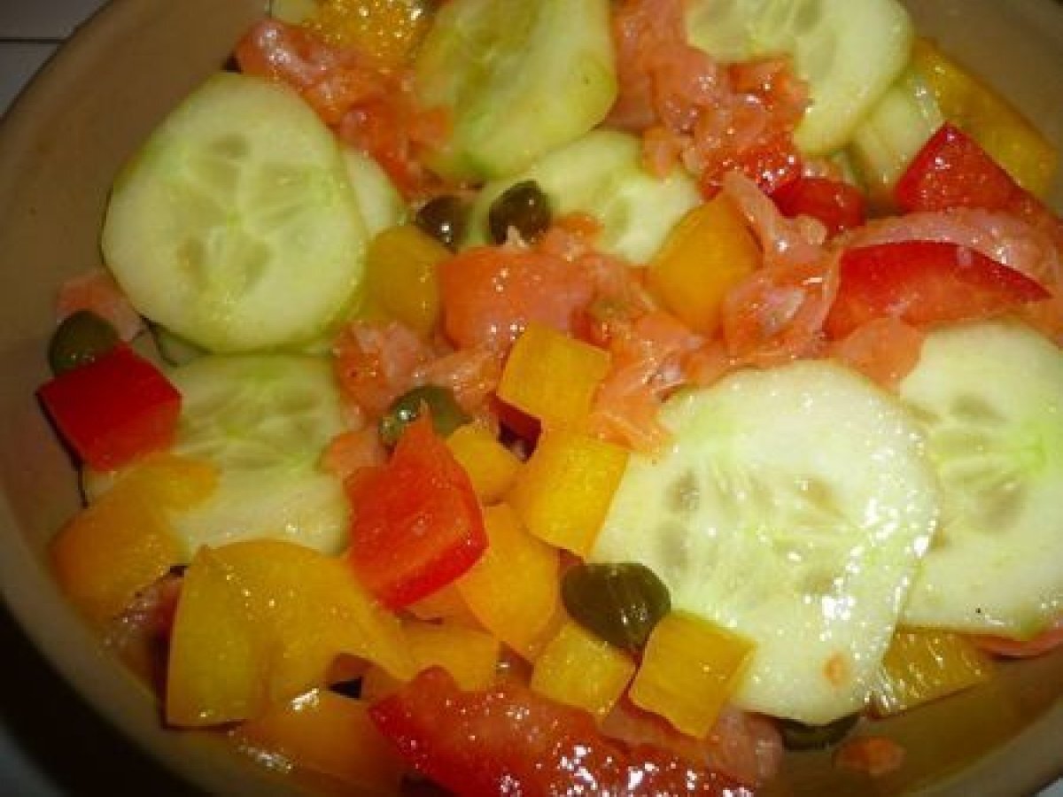 Salade de saumon fumé toute en fraîcheur Entréefacile10 min379 Kcal Envoyer cette recette à un ami Imprimer cette page Poser une question à l'auteur Publier votre photo de cette recette Ingrédients 2 180 gr de saumon fumé 1 concombre 1 tomate 1 poivron jaune 2 c. à c. de câpres au vinaigre. Pour la vinaigrette : 2 c. à s. d'huile d'olive 1,5 c. à s. de jus de citron 1 c. à c. de miel 1 trait de tabasco Sel et Poivre. Coût estimé: 12.33Euros€ (6.17€/part)