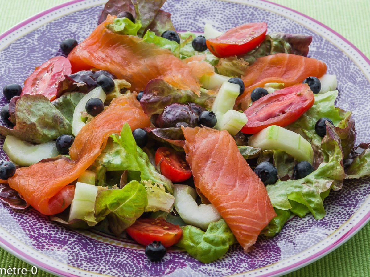 Salade de truite fumée, myrtilles, concombre et tomates