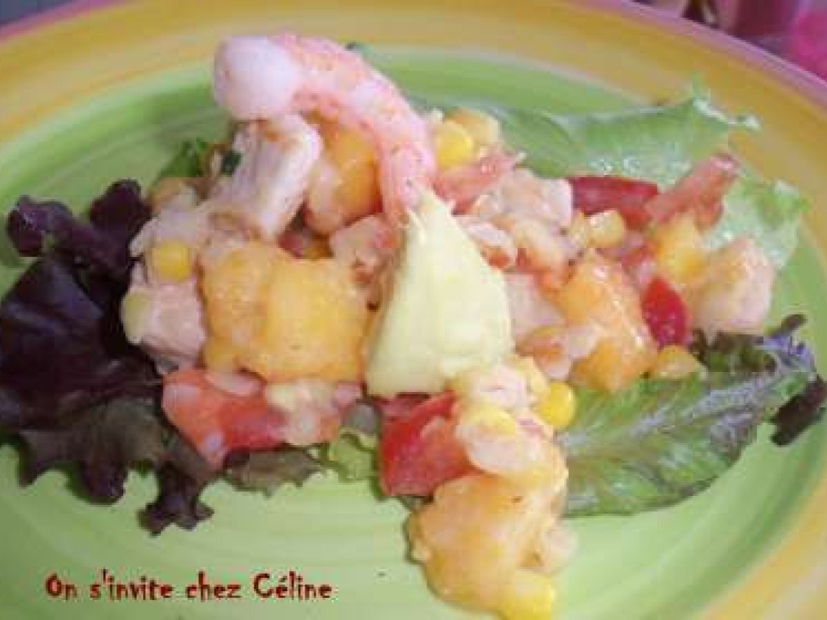 Salade exotique Entréefacile25 min348 Kcal Envoyer cette recette à un ami Imprimer cette page Poser une question à l'auteur Publier votre photo de cette recette Ingrédients 6 250g de blanc de dinde 2 pêches jaunes Une quinzaine de crevettes décortiquées 1 avocat 3 tomates 1 oignon 2 citrons verts 1 boîte de maïs (285g) 90g de mélange de jeunes pousses 5 càs de lait de coco 2 càs de nuoc-mâm 2 brins de basilic 3 càs d'huile d'olive Sel et poivre Coût estimé: 8.09Euros€ (1.35€/part)