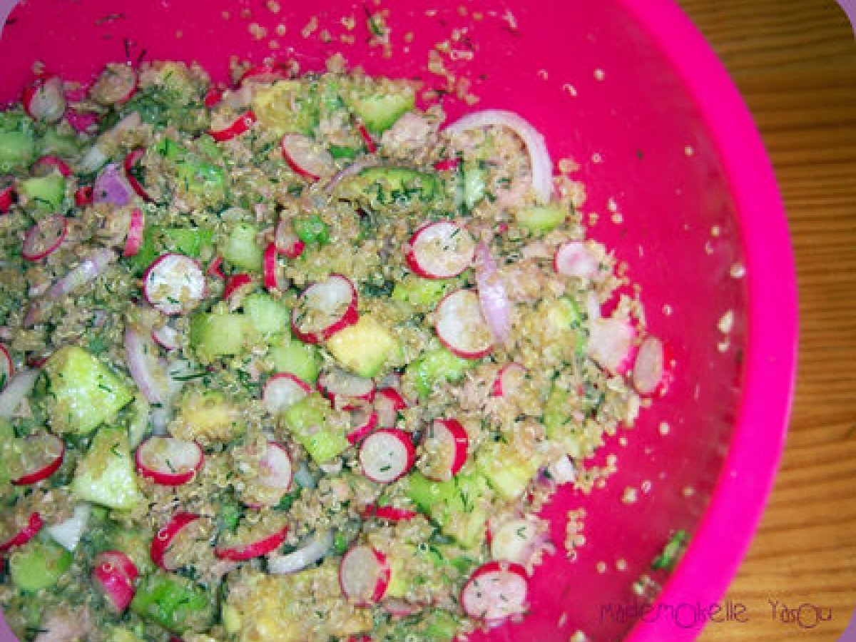 Salade girly : quinoa-avocat-thon-radis-concombre... Entréefacile20 min Envoyer cette recette à un ami Imprimer cette page Poser une question à l'auteur Publier votre photo de cette recette Ingrédients 3 1 cup de quinoa 1 botte de radis 1/2 concombre 1 avocat 1 petite boite de thon 1 oignon nouveau le jus d'un citron vert du sel 1 filet d'huile d'olive de l'aneth émincée