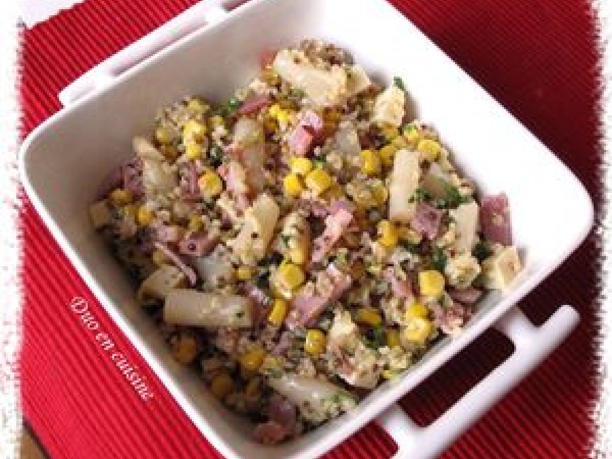 Salade gourmande aux graines votez maintenant Entréefacile25 min Envoyer cette recette à un ami Imprimer cette page Poser une question à l'auteur Publier votre photo de cette recette Ingrédients 2 75 g d'un mélange de quinoa et de boulgour 100 g de bacon cuit 1 petite boîte de 150 g de maïs égoutté 1 petite boîte de 100 g de têtes d'asperges blanches égouttées 50 g de gouda au cumin 1 cube de bouillon de légumes 1 belle poignée de persil haché Huile d'olive et vinaigre balsamique Sel poivre